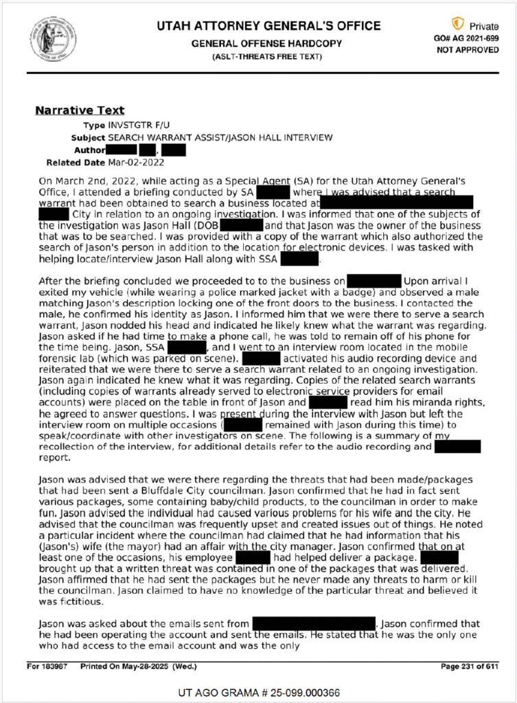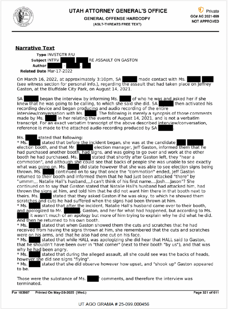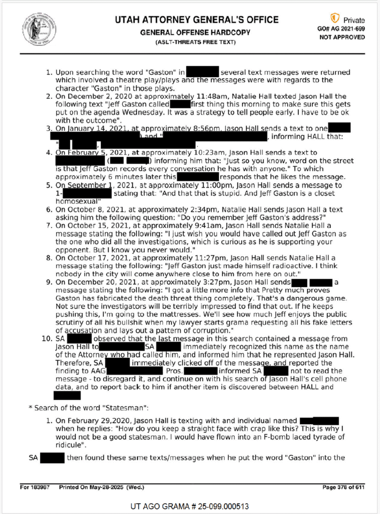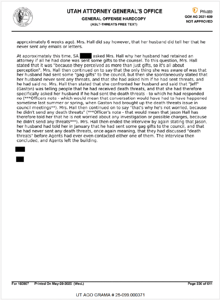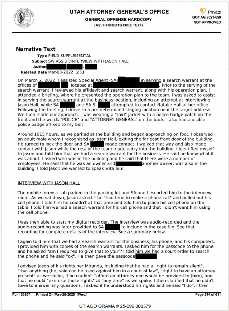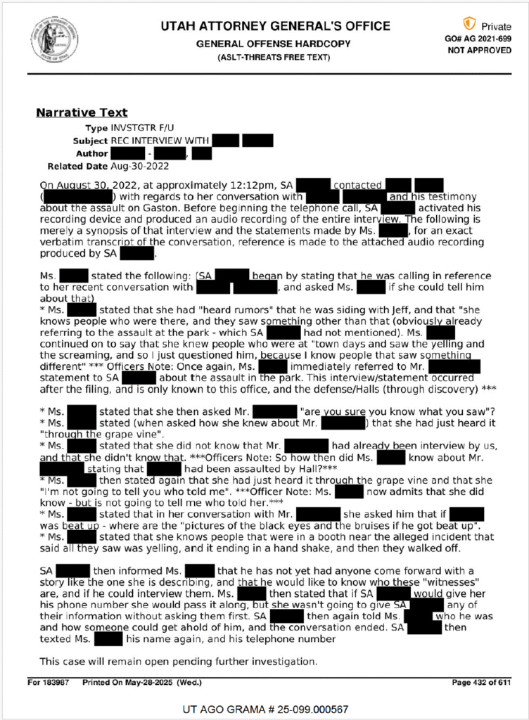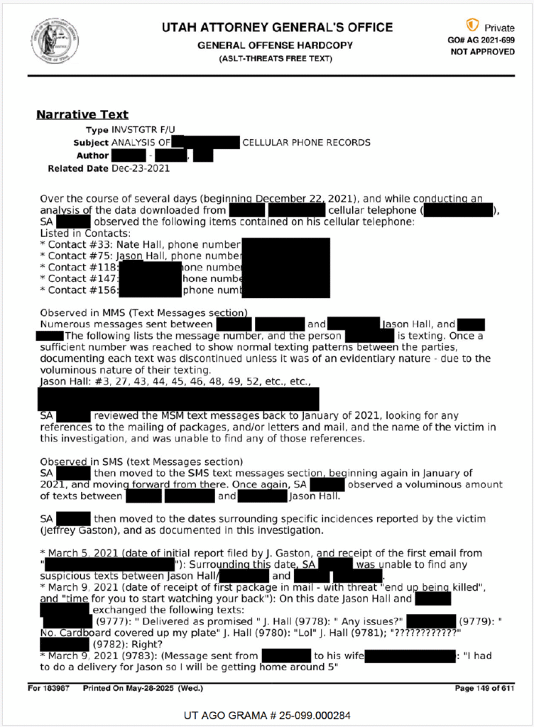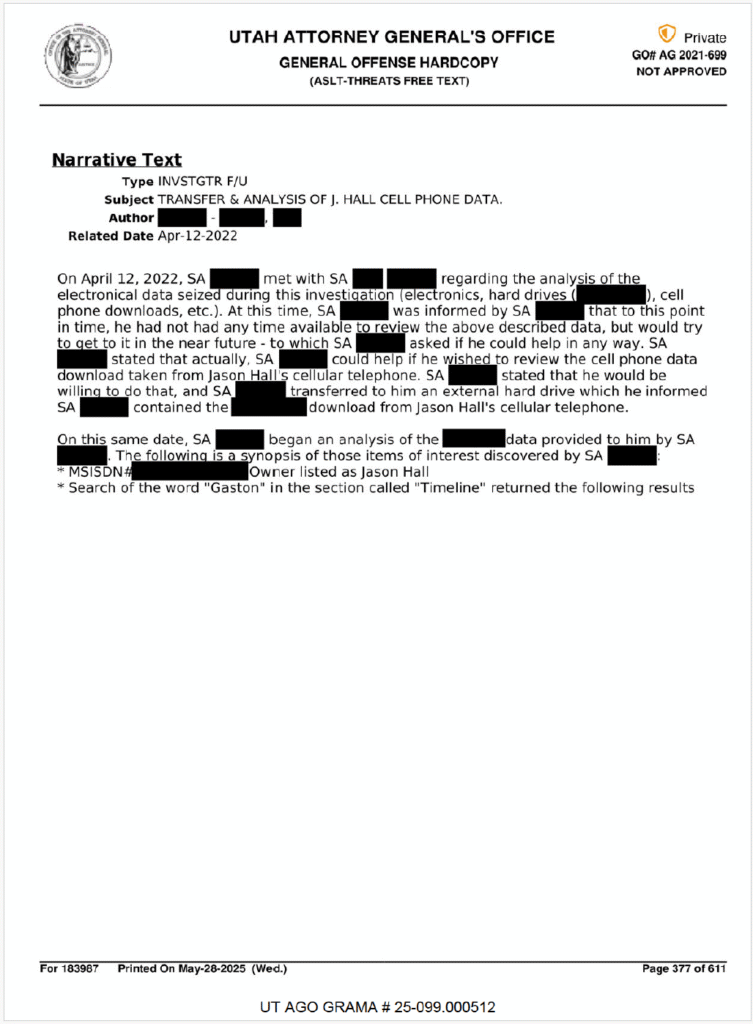 The following are excerpts from the lengthy file maintained by investigators of the Office of the Utah Attorney General, documenting their investigation activities into the criminal case brought against Jason Hall. The file was obtained through a GRAMA request. GRAMA is the Government Records Access and Management Act, Utah’s version of the Freedom of Information Act. Large portions of the file obtained were redacted to protect personal and sensitive information, leaving a record suitable for disclosure to the public.
