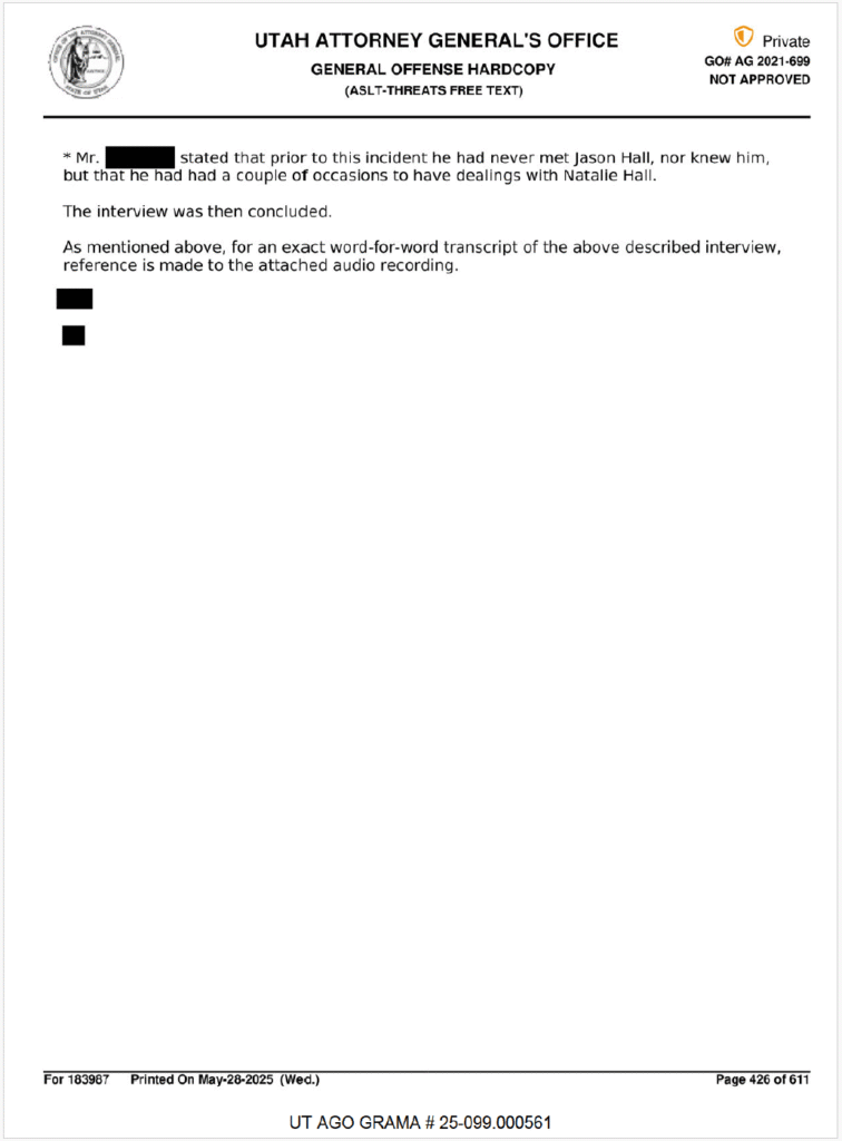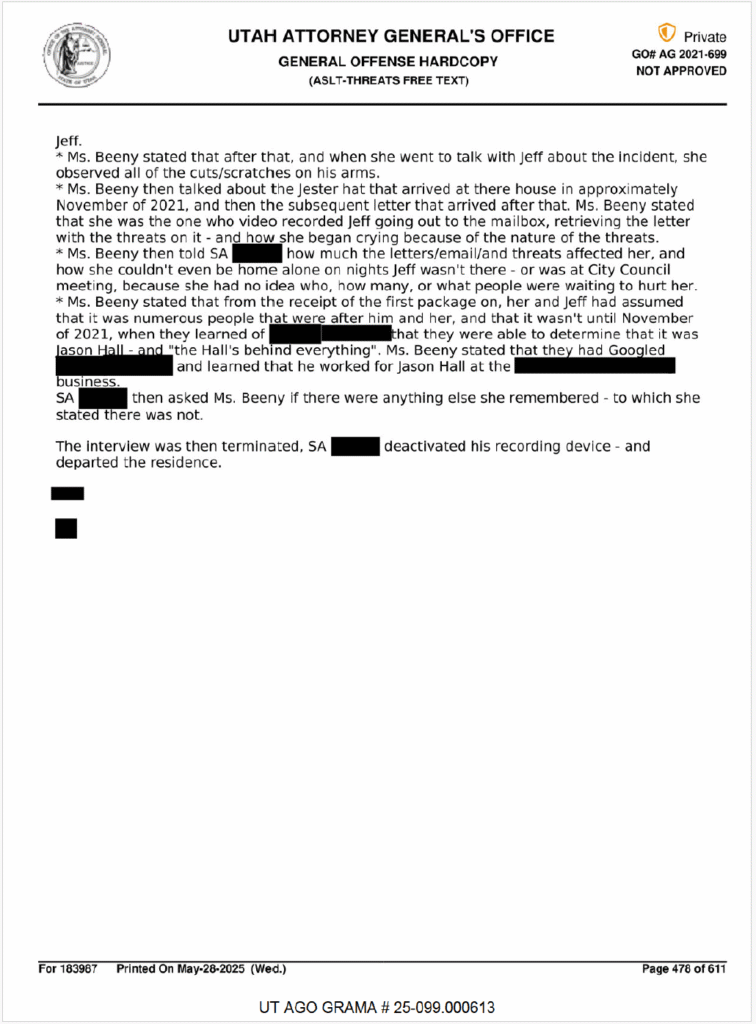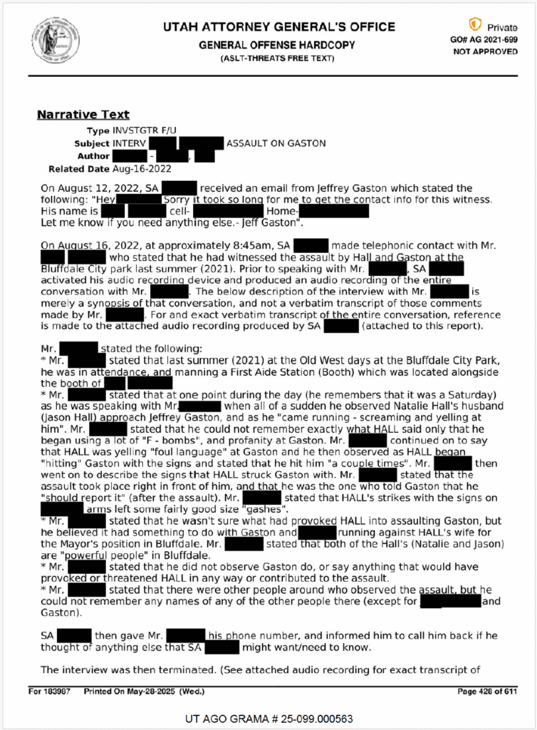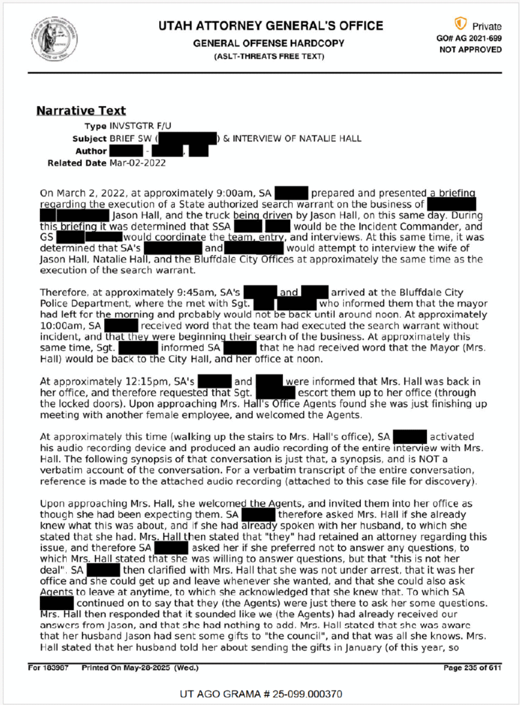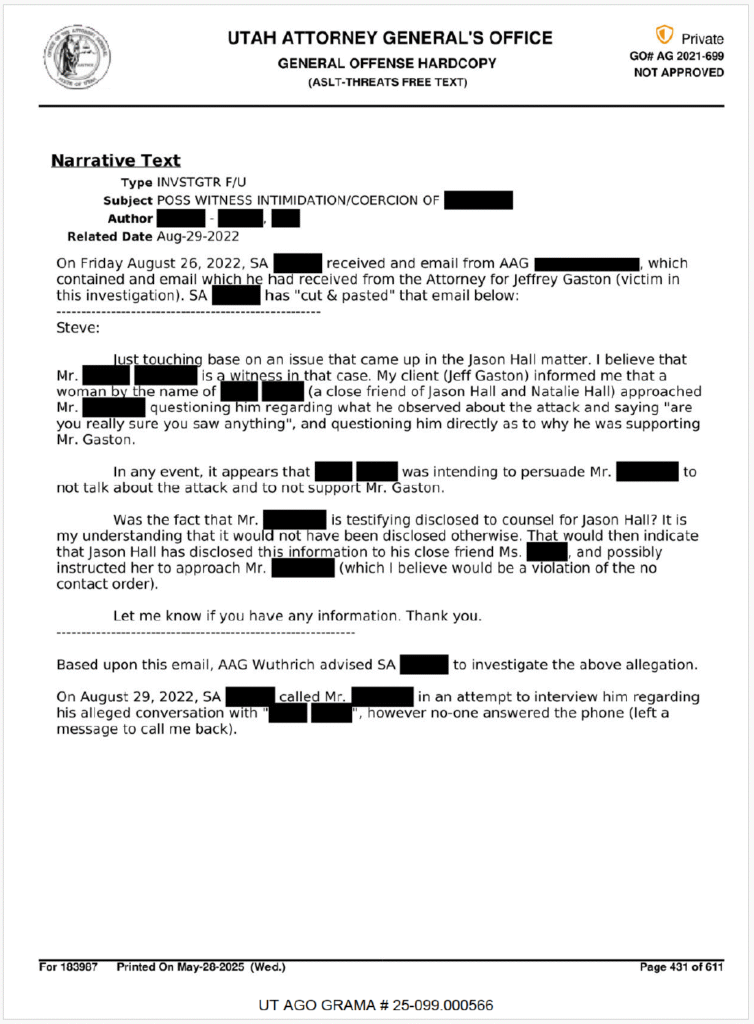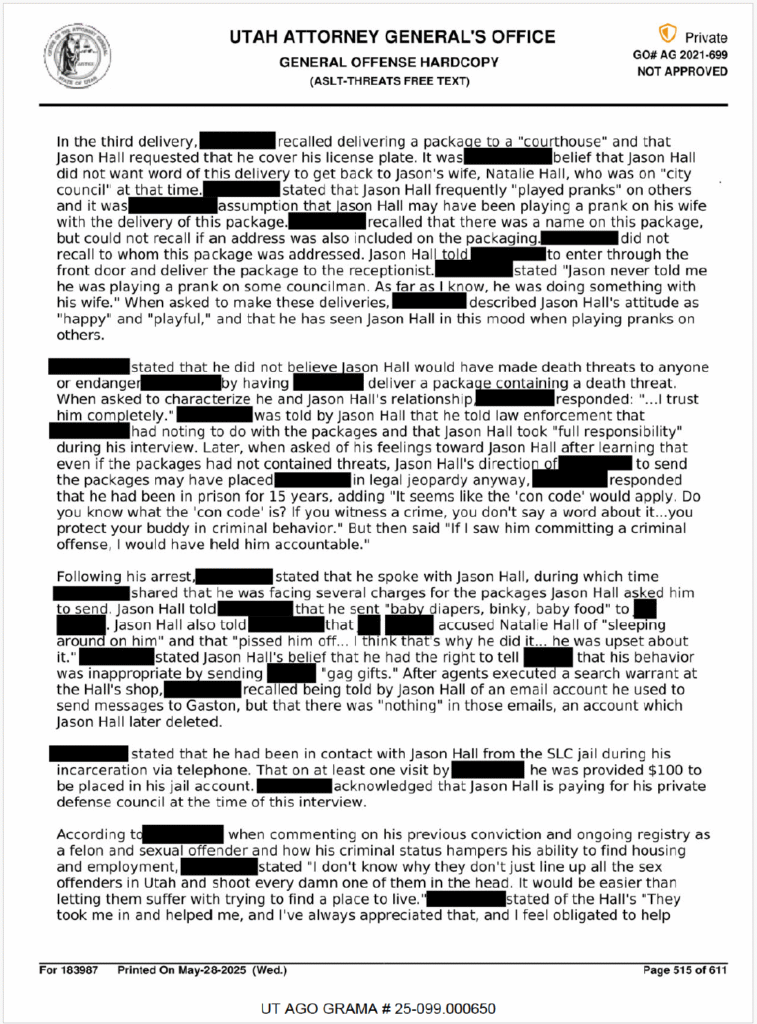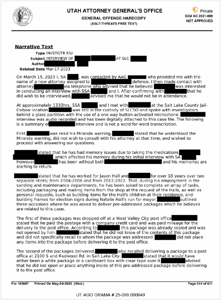 The following are excerpts from the lengthy file maintained by investigators of the Office of the Utah Attorney General, documenting their investigation activities into the criminal case brought against Jason Hall. The file was obtained through a GRAMA request. GRAMA is the Government Records Access and Management Act, Utah’s version of the Freedom of Information Act. Large portions of the file obtained were redacted to protect personal and sensitive information, leaving a record suitable for disclosure to the public.
