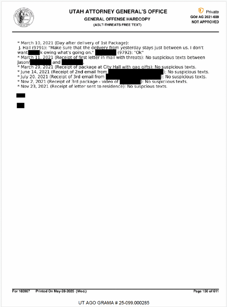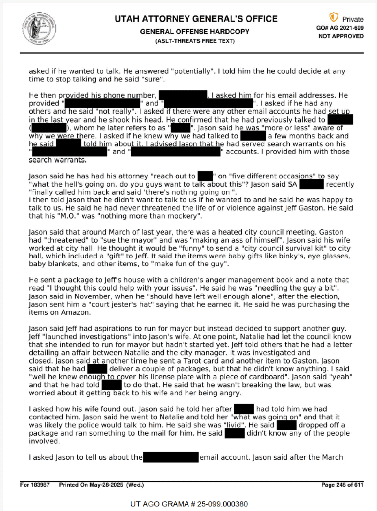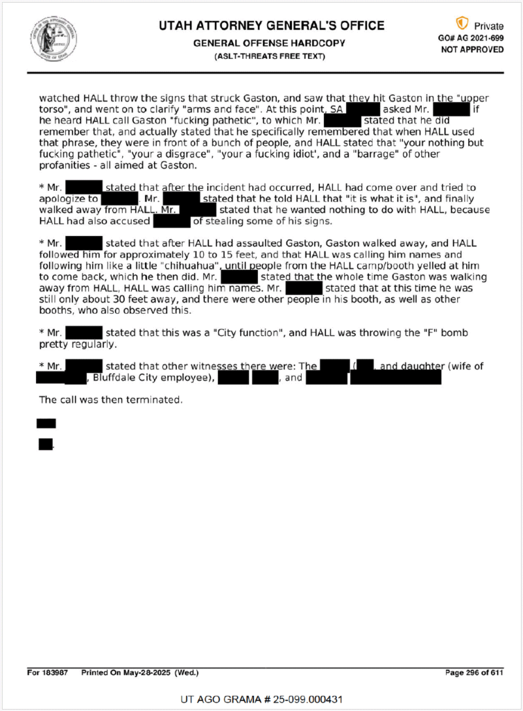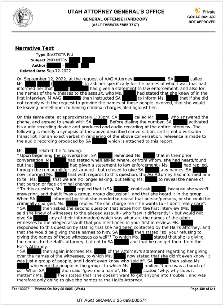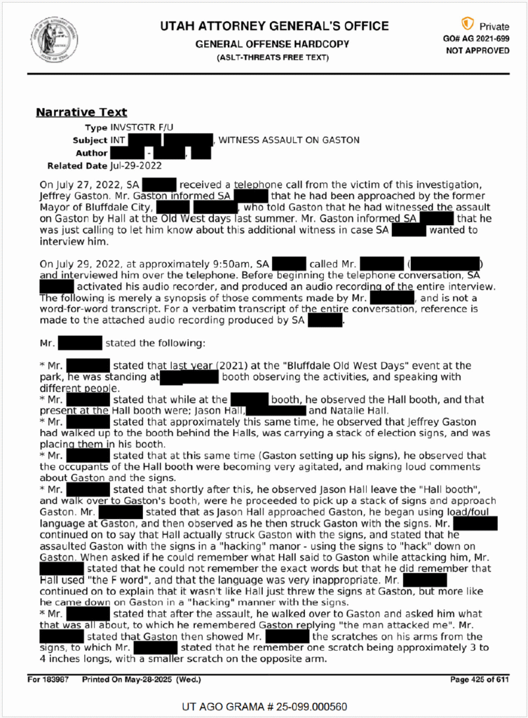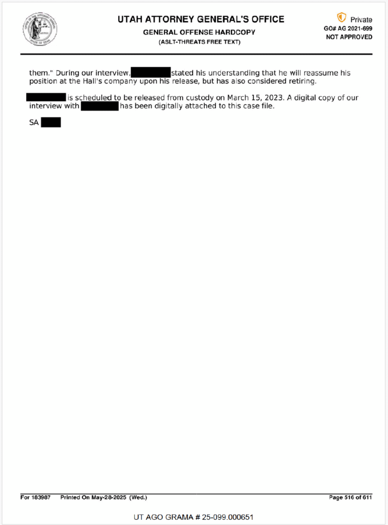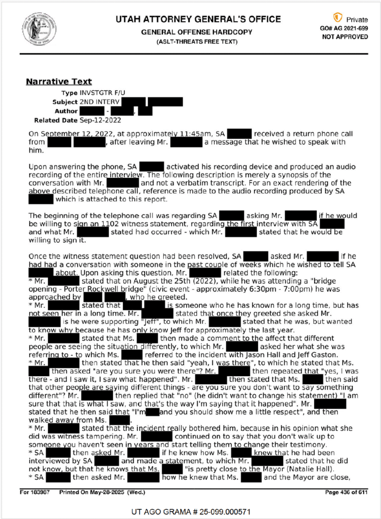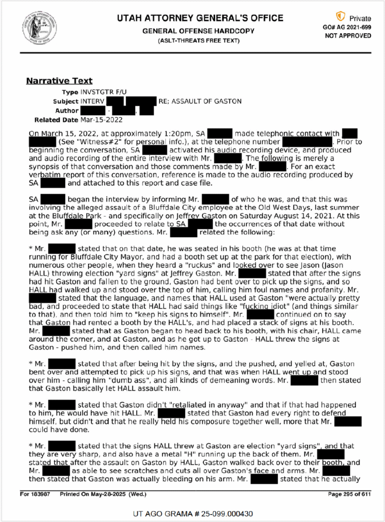 The following are excerpts from the lengthy file maintained by investigators of the Office of the Utah Attorney General, documenting their investigation activities into the criminal case brought against Jason Hall. The file was obtained through a GRAMA request. GRAMA is the Government Records Access and Management Act, Utah’s version of the Freedom of Information Act. Large portions of the file obtained were redacted to protect personal and sensitive information, leaving a record suitable for disclosure to the public.