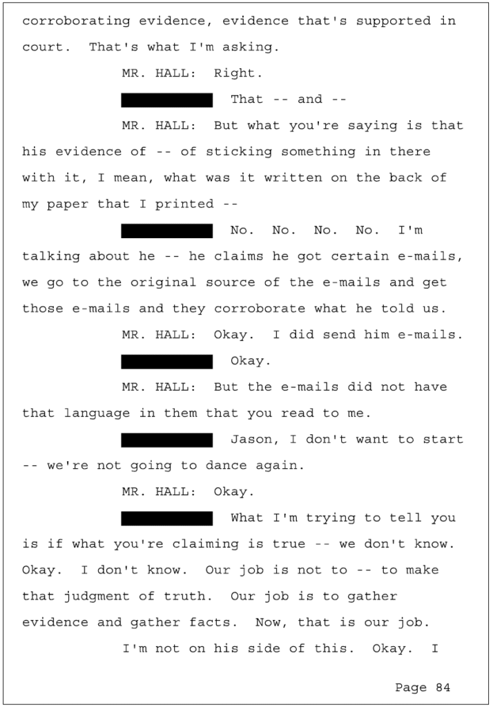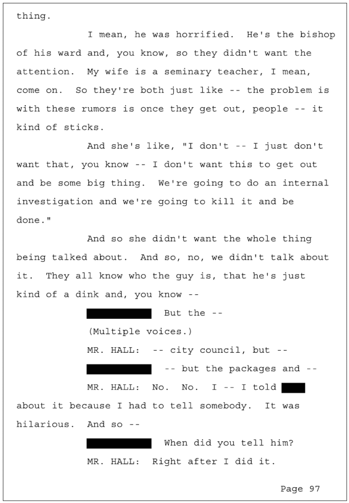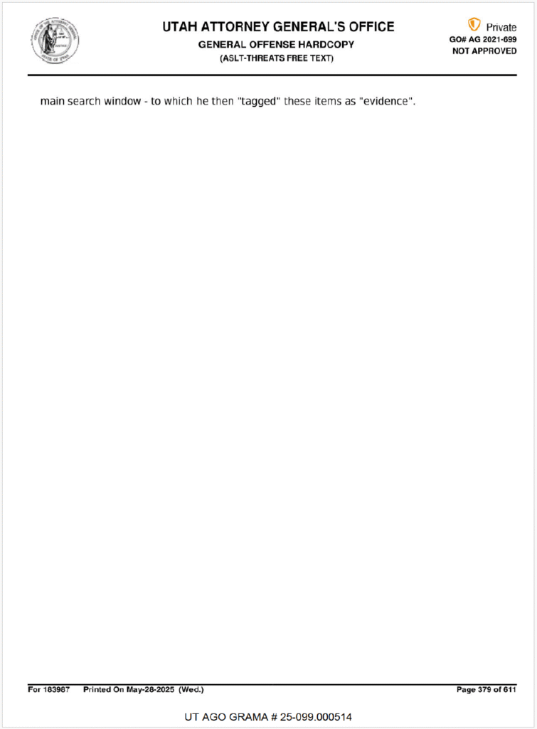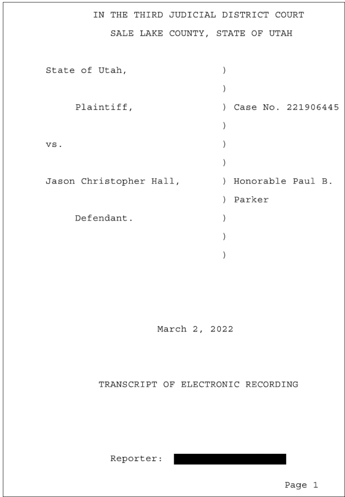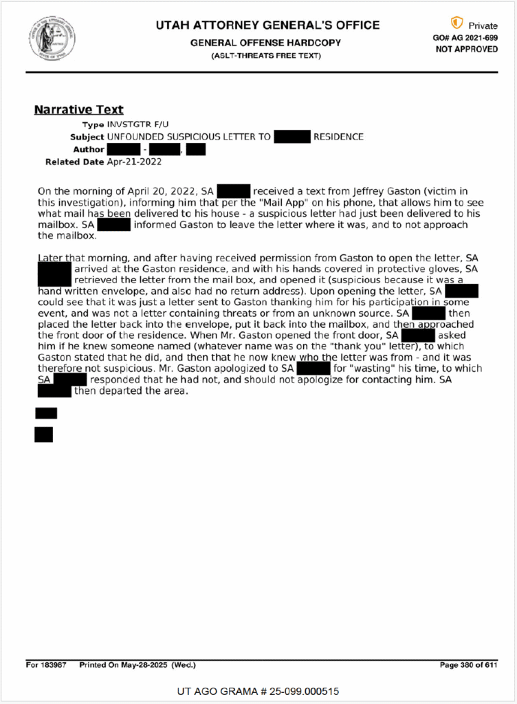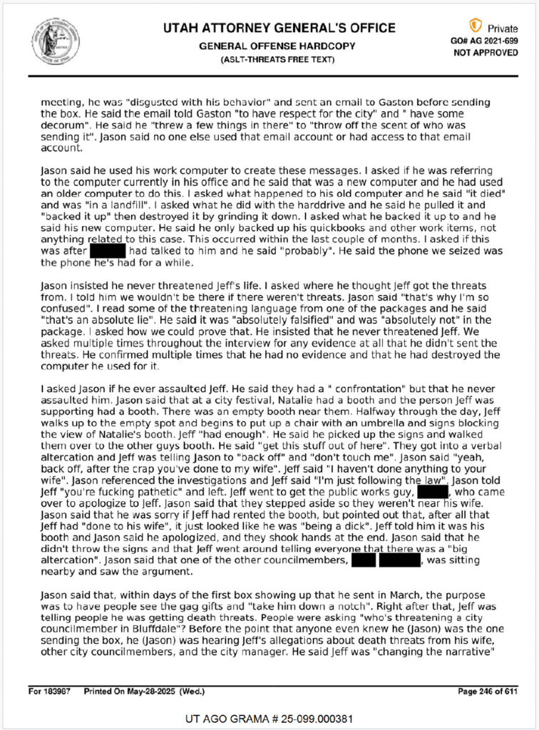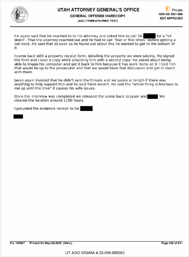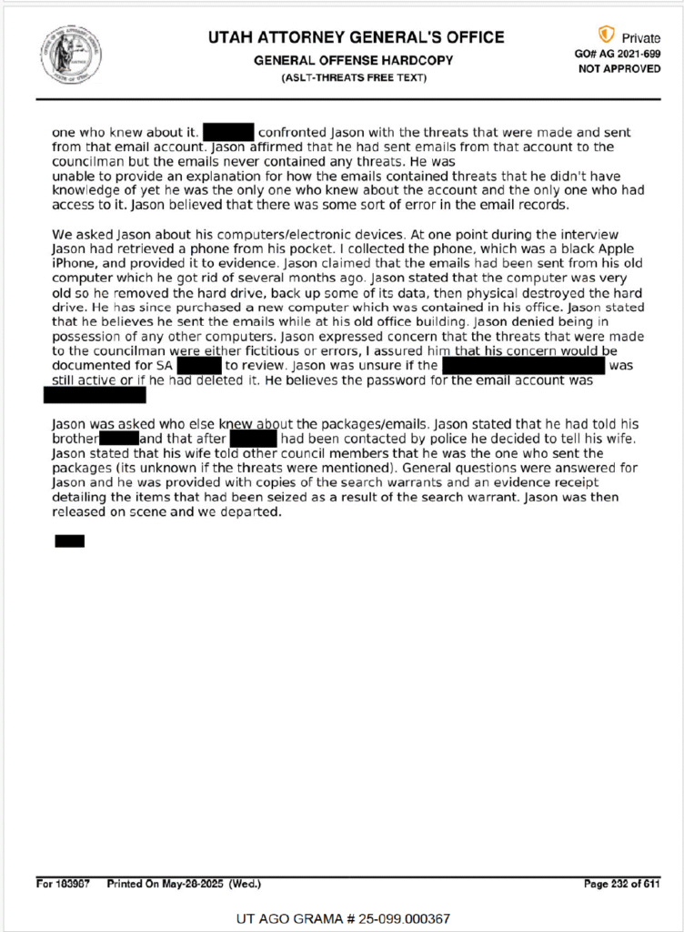 The following are excerpts from the lengthy file maintained by investigators of the Office of the Utah Attorney General, documenting their investigation activities into the criminal case brought against Jason Hall. The file was obtained through a GRAMA request. GRAMA is the Government Records Access and Management Act, Utah’s version of the Freedom of Information Act. Large portions of the file obtained were redacted to protect personal and sensitive information, leaving a record suitable for disclosure to the public.