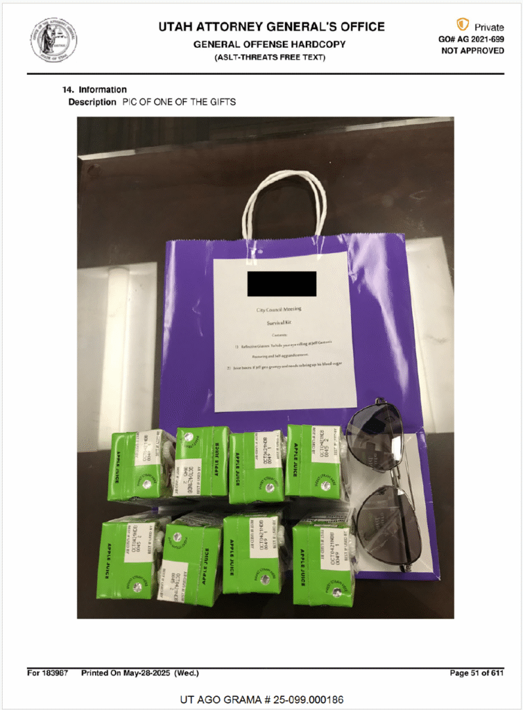 9 March 2021 George Schliesser, an employee of Jason Hall, delivered a box to Bluffdale City Hall at the direction of Jason Hall. It contained gag gifts for each City Council member and the mayor, including pacifiers and reflective glasses “to hide your eye rolling at Jeff Gaston’s Posturing and Self-aggrandizement.”