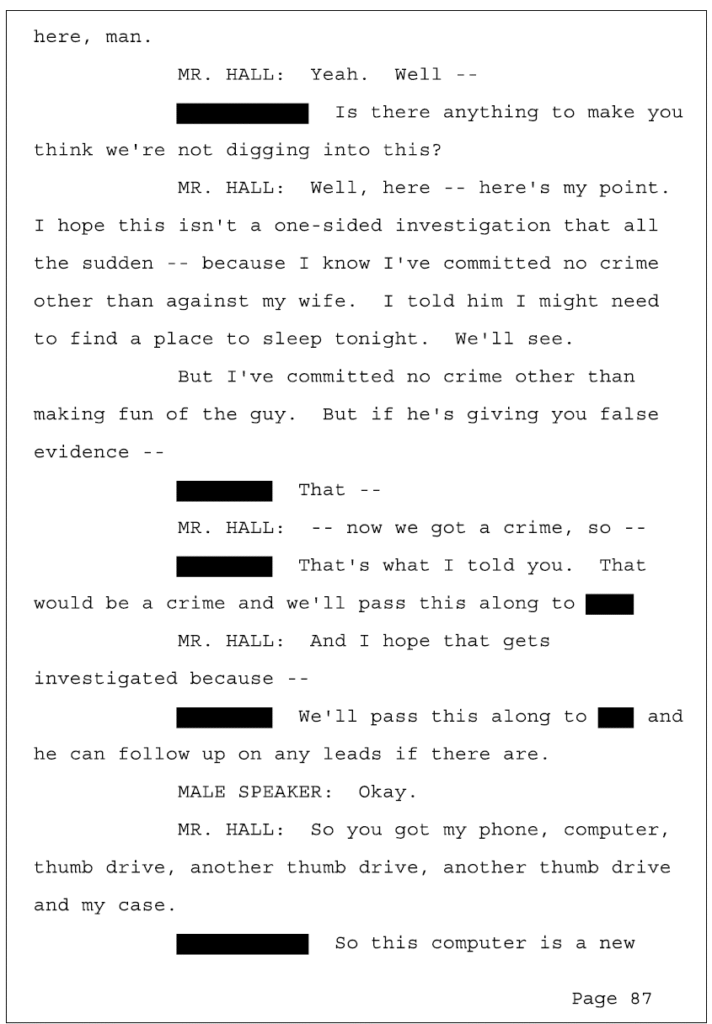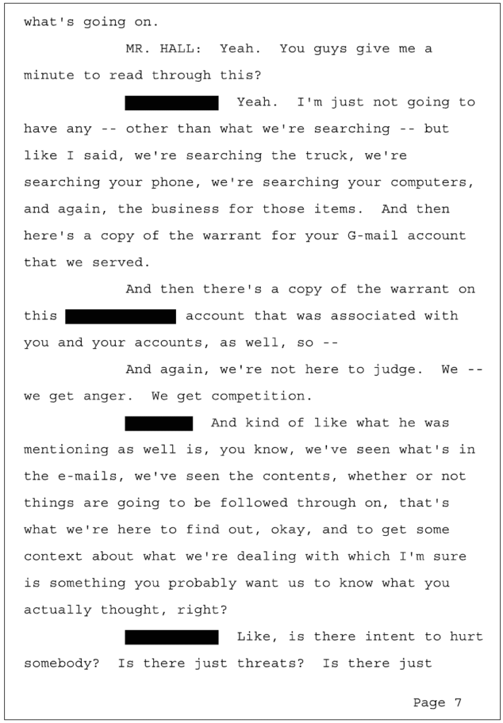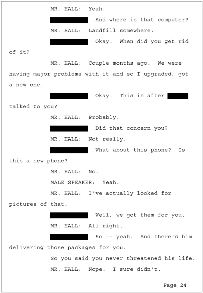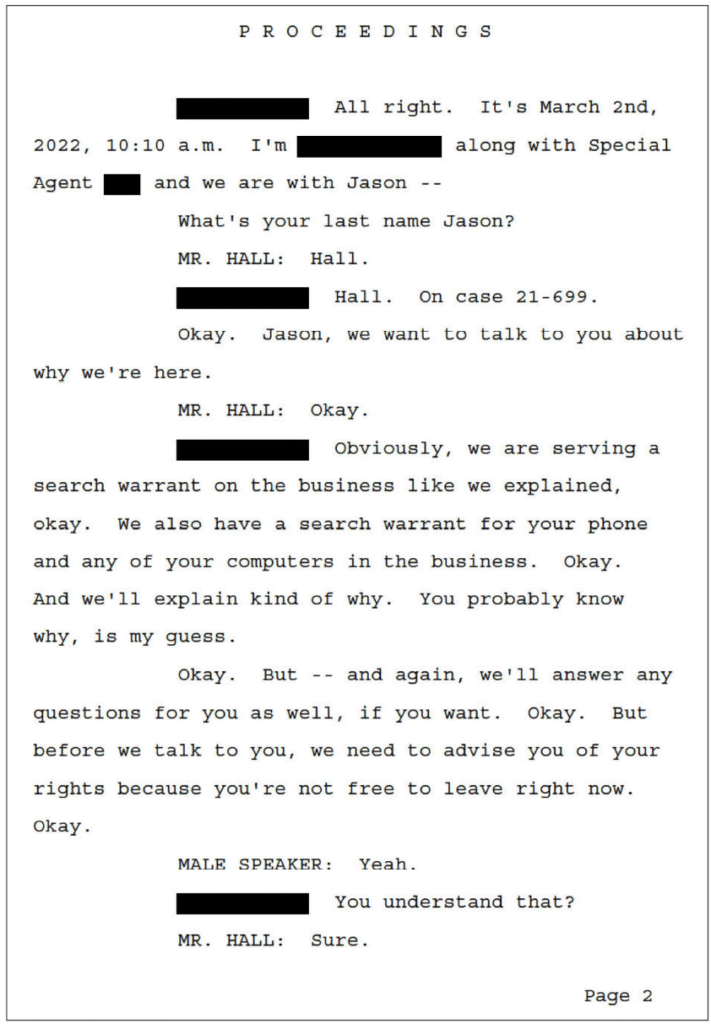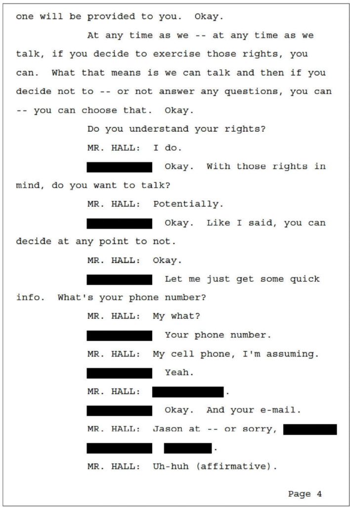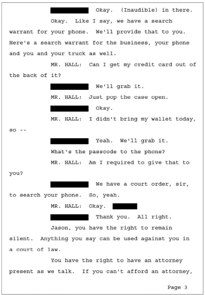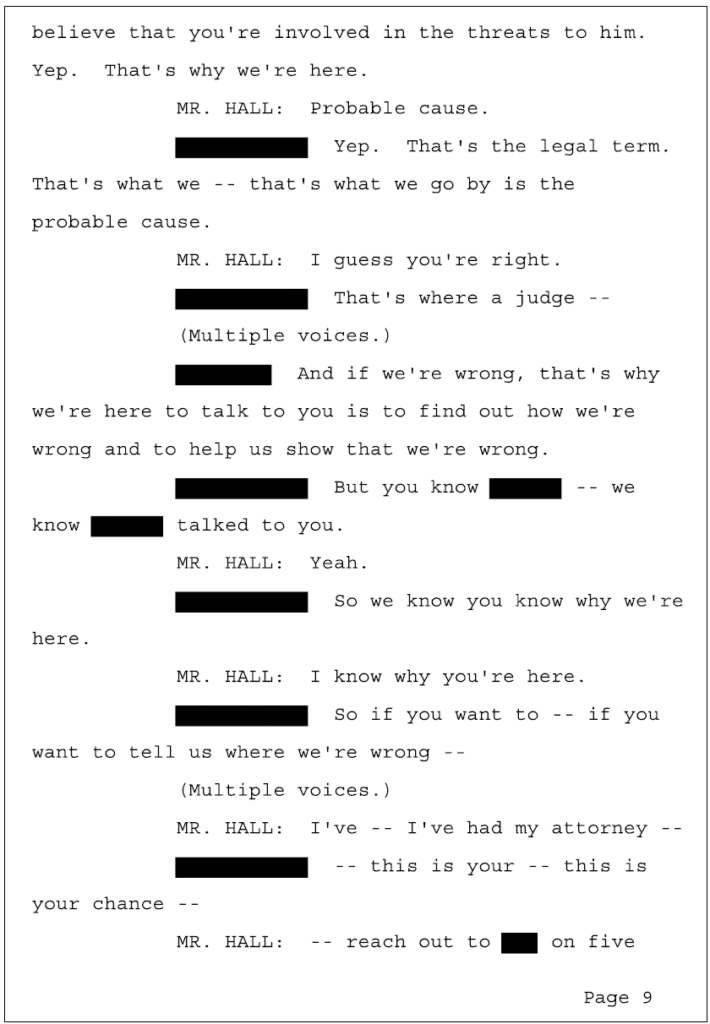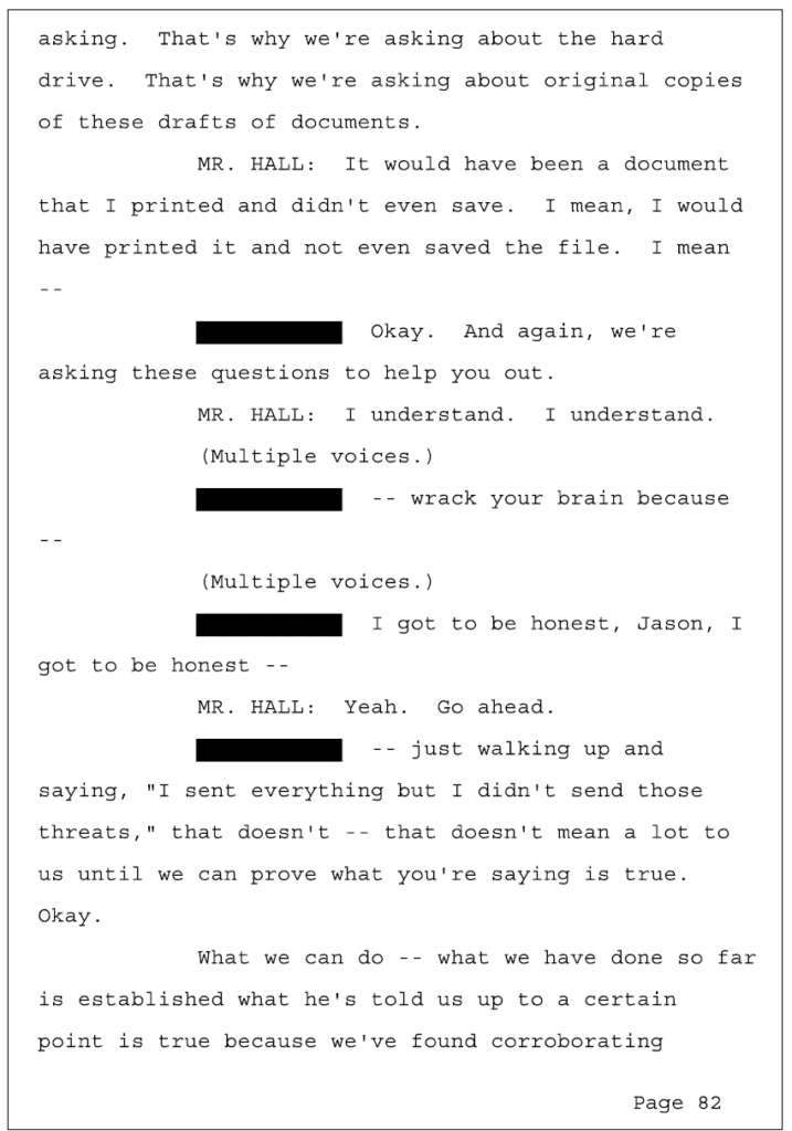 - 2 March 2022 Complete transcript of the interview two officers conducted with Jason Hall. This transcript was later suppressed from evidence in this case due to the officers’ failing to clarify Hall’s equivocal response of “potentially,” when asked if Hall would be willing to answer questions. In this interview, Jason Hall admits to sending the emails but denies sending threats in emails or letters.