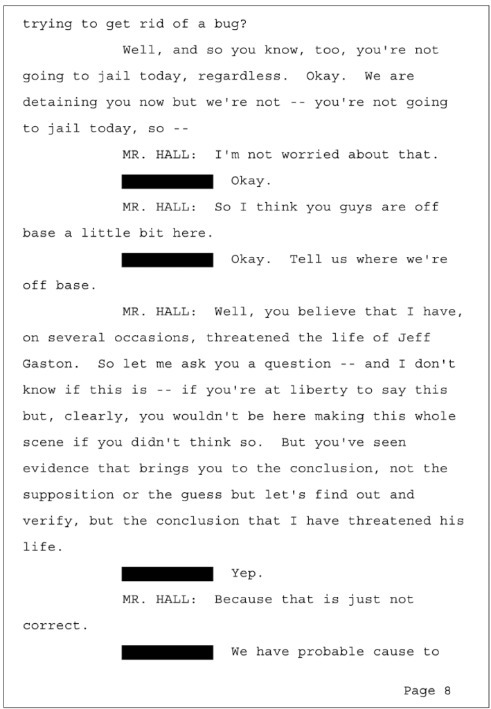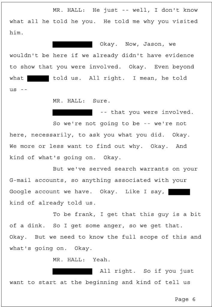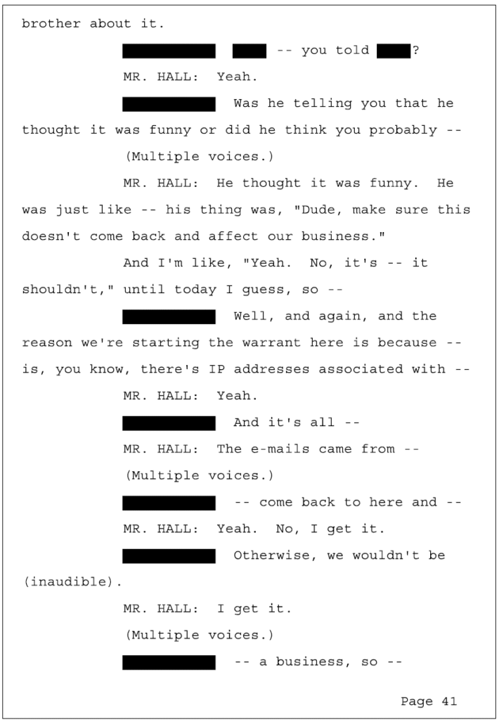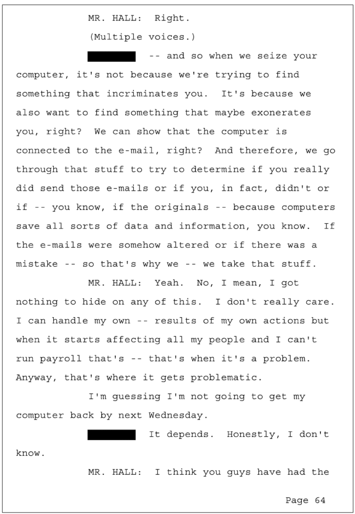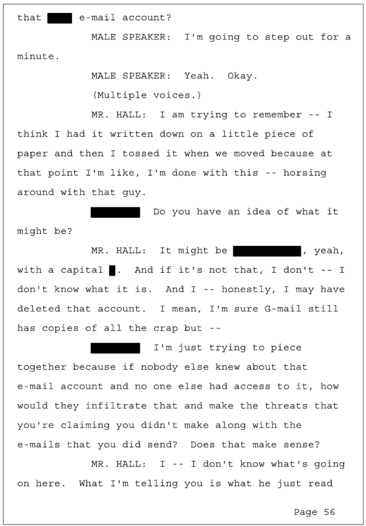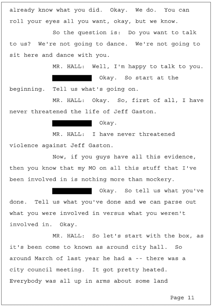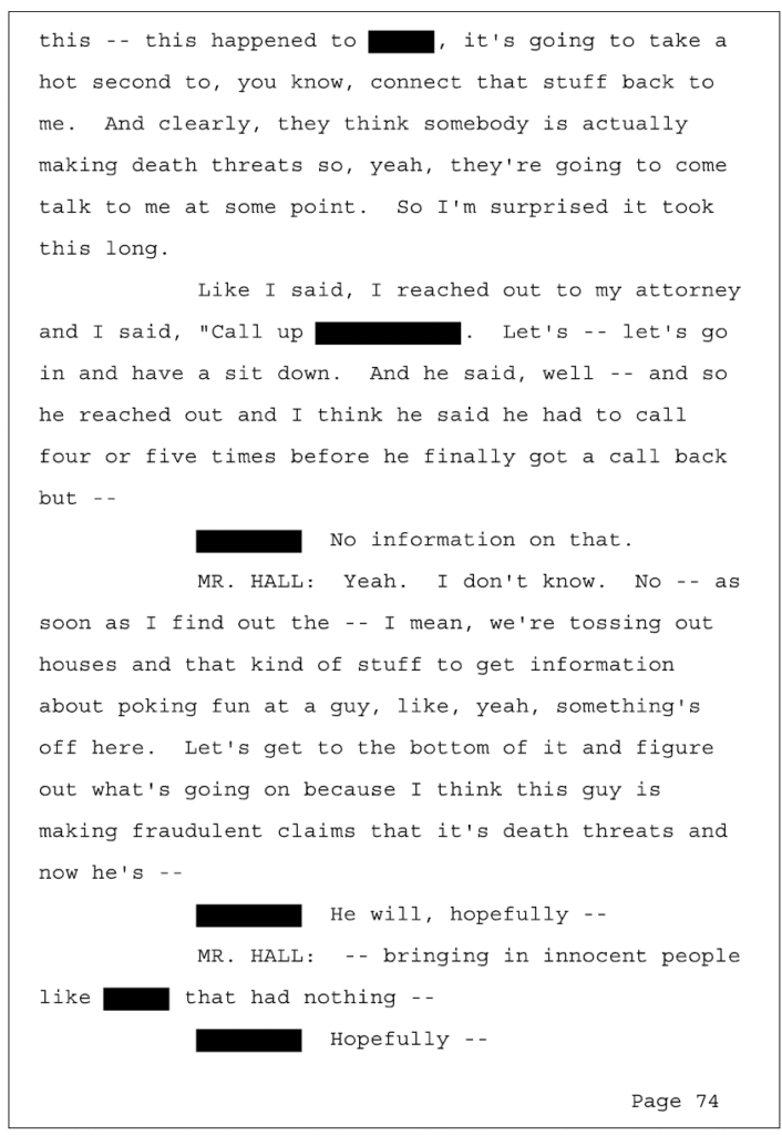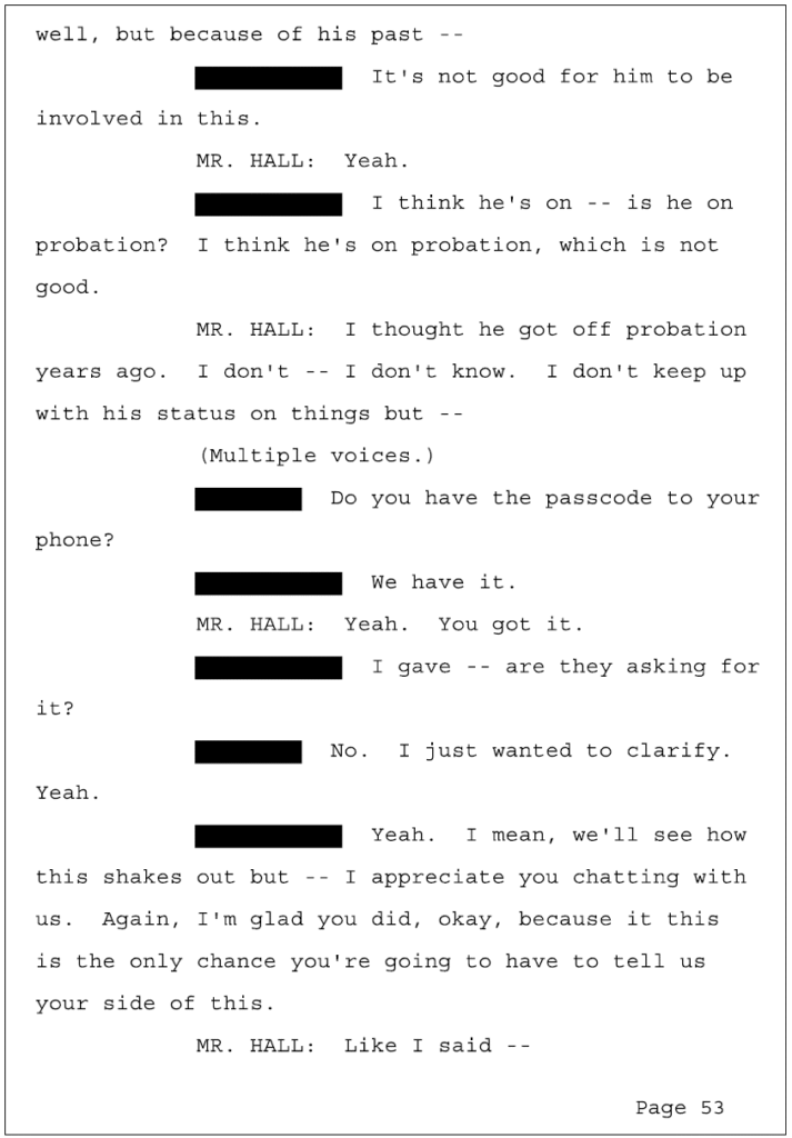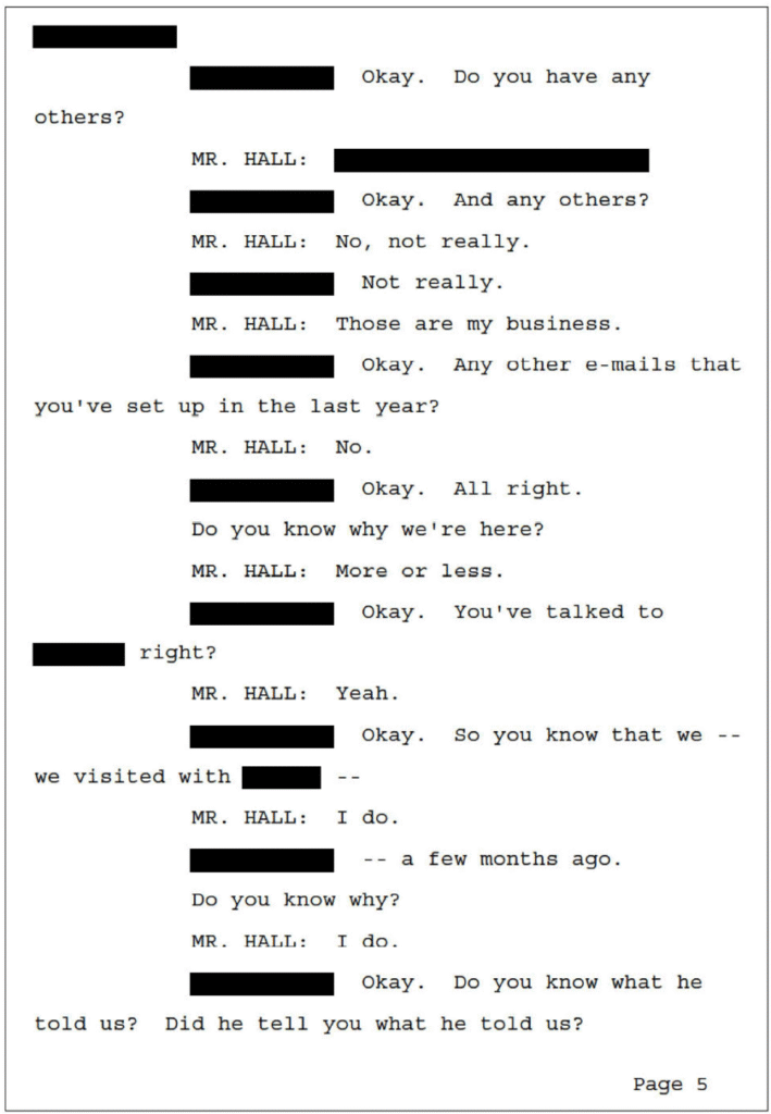 - 2 March 2022 Complete transcript of the interview two officers conducted with Jason Hall. This transcript was later suppressed from evidence in this case due to the officers’ failing to clarify Hall’s equivocal response of “potentially,” when asked if Hall would be willing to answer questions. In this interview, Jason Hall admits to sending the emails but denies sending threats in emails or letters.
