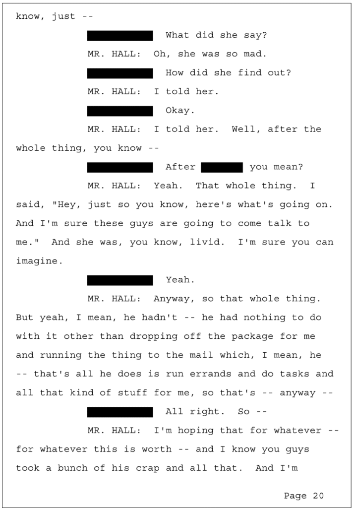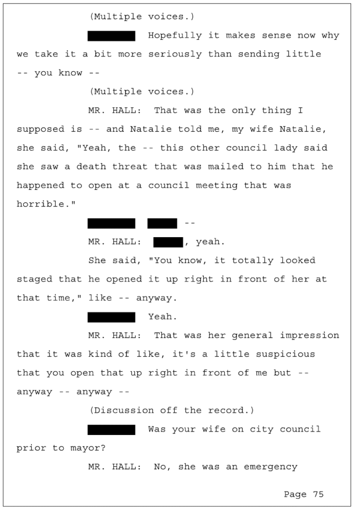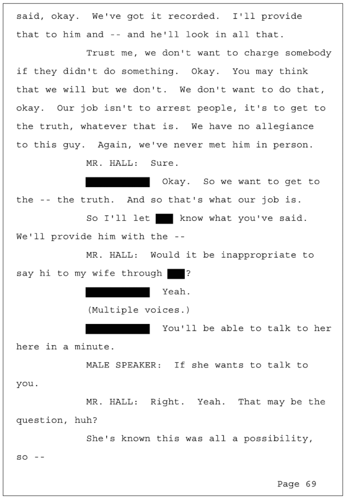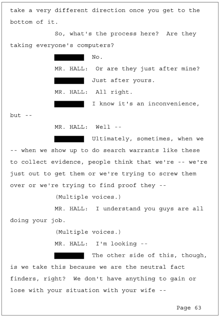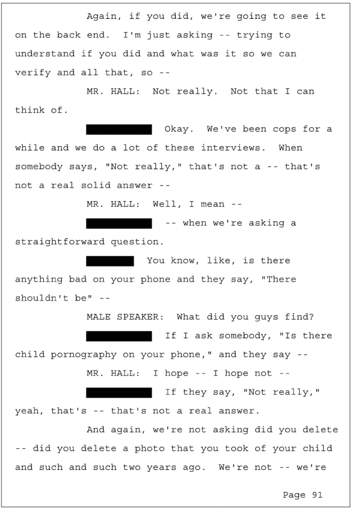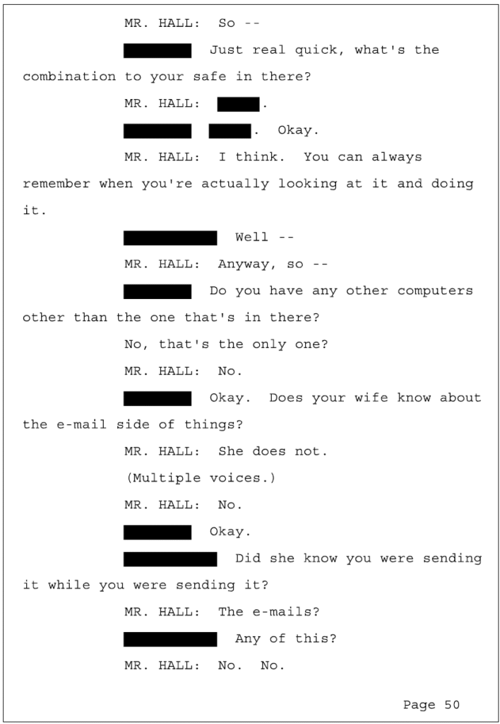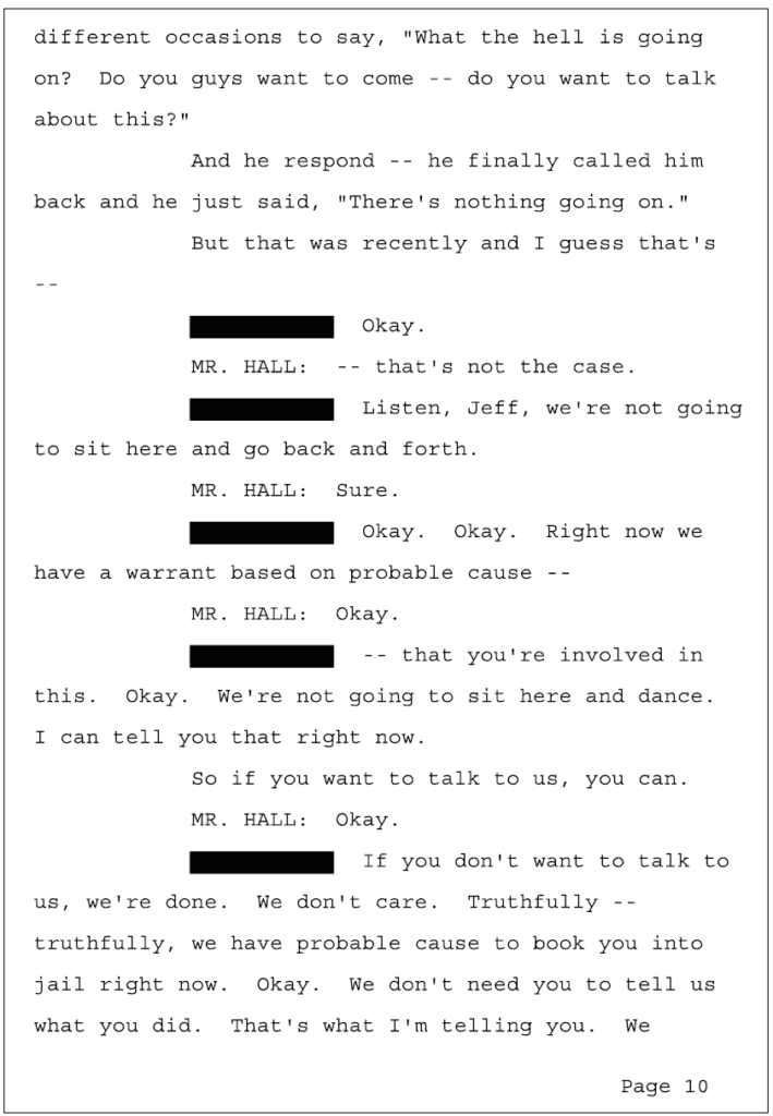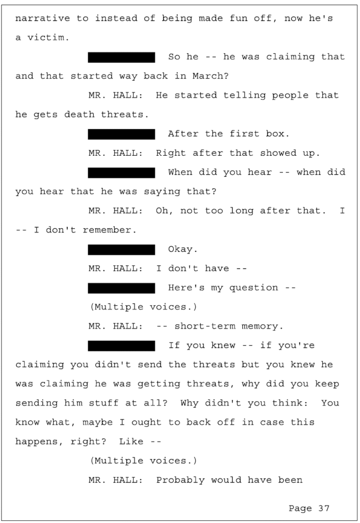 - 2 March 2022 Complete transcript of the interview two officers conducted with Jason Hall. This transcript was later suppressed from evidence in this case due to the officers’ failing to clarify Hall’s equivocal response of “potentially,” when asked if Hall would be willing to answer questions. In this interview, Jason Hall admits to sending the emails but denies sending threats in emails or letters.