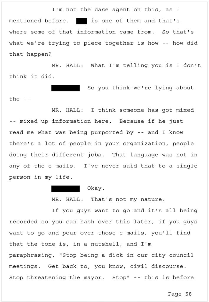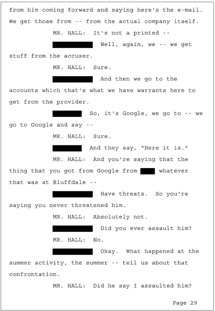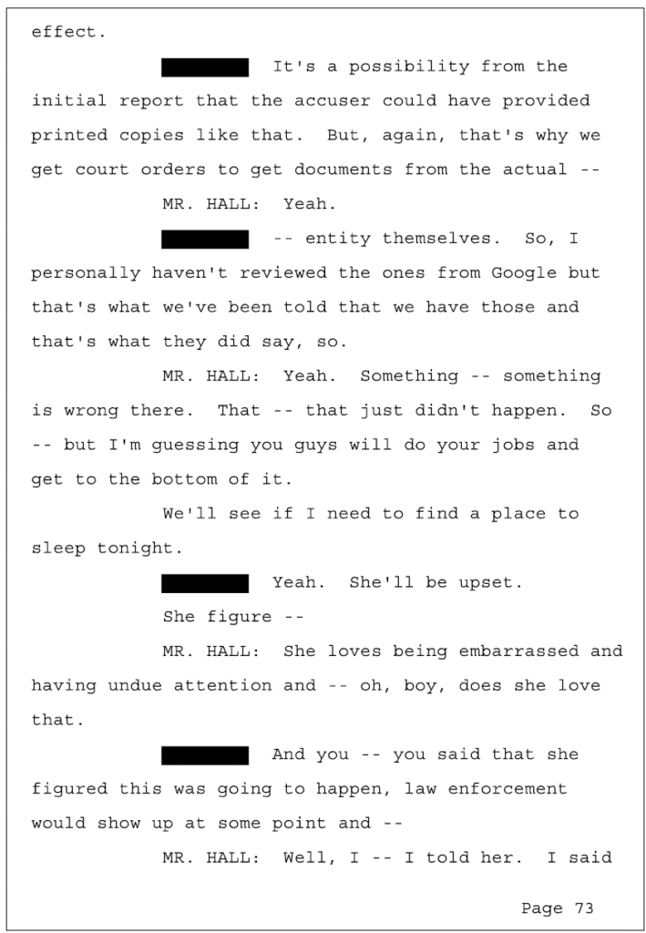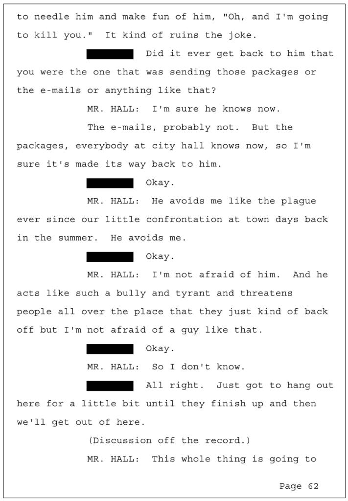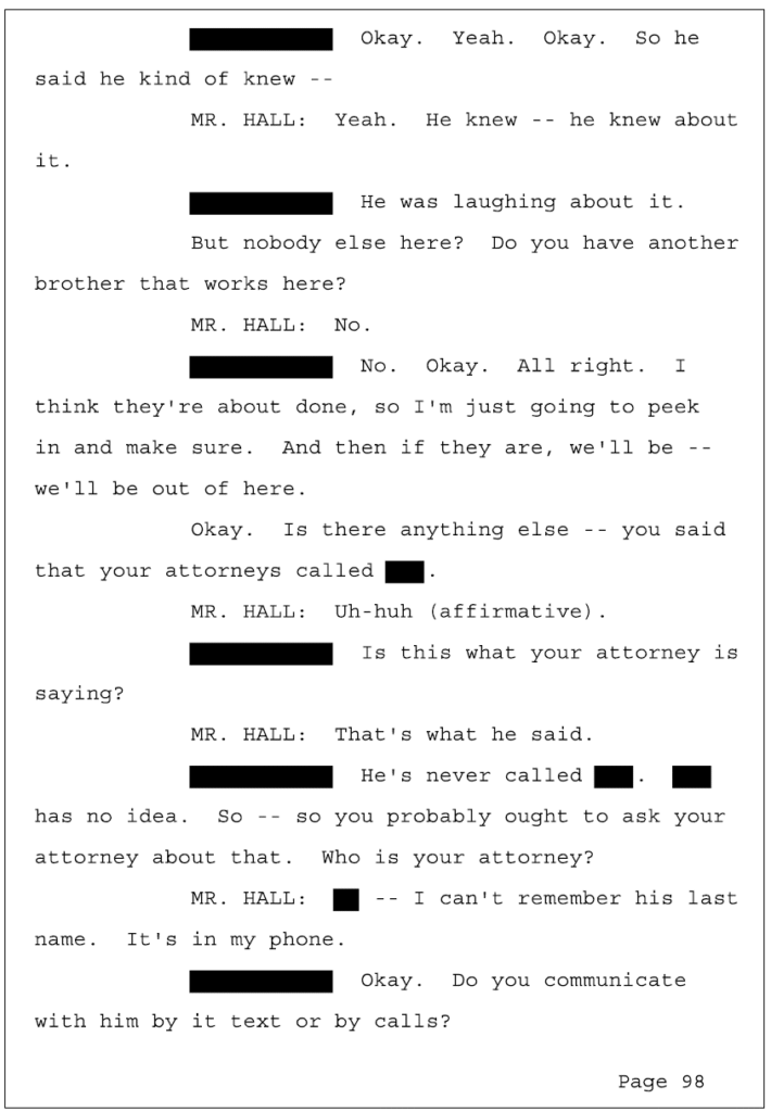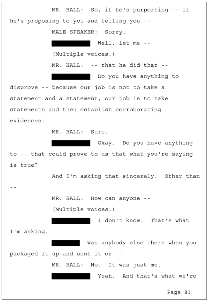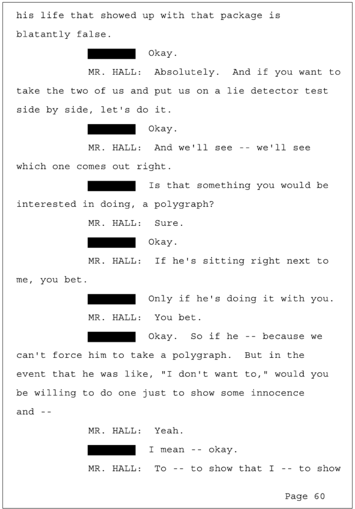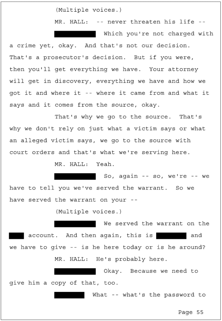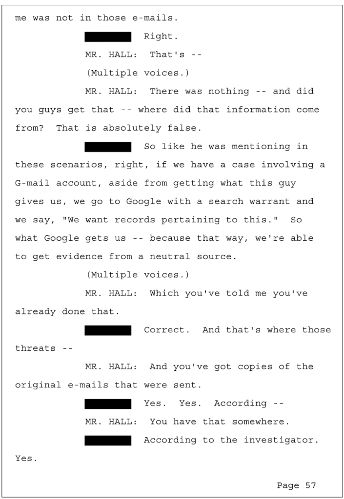 - 2 March 2022 Complete transcript of the interview two officers conducted with Jason Hall. This transcript was later suppressed from evidence in this case due to the officers’ failing to clarify Hall’s equivocal response of “potentially,” when asked if Hall would be willing to answer questions. In this interview, Jason Hall admits to sending the emails but denies sending threats in emails or letters.