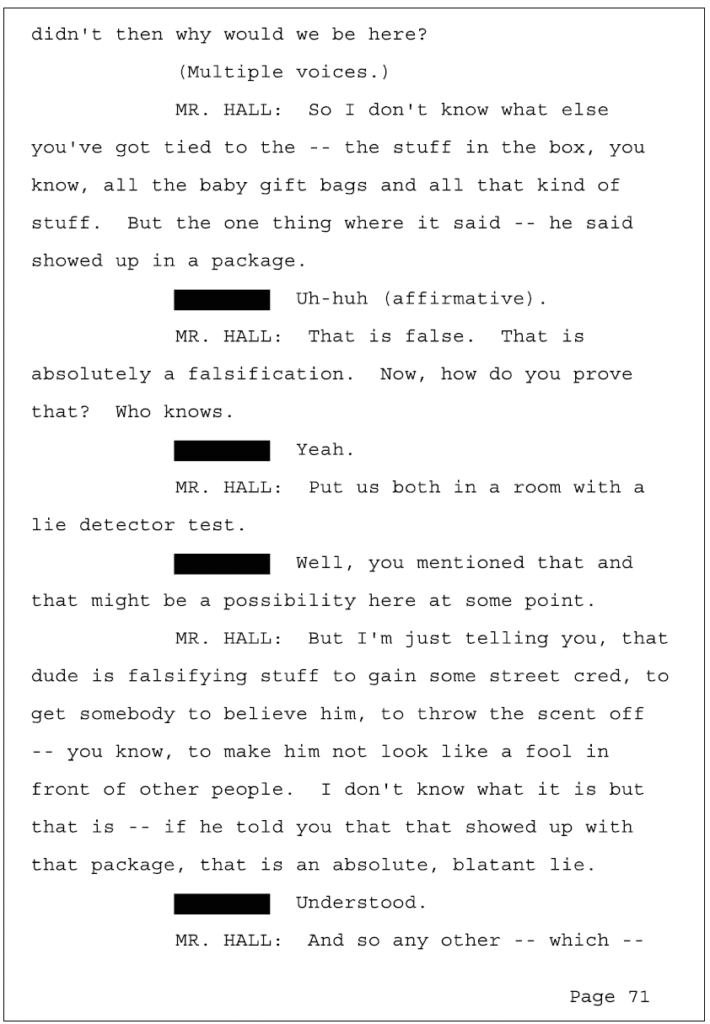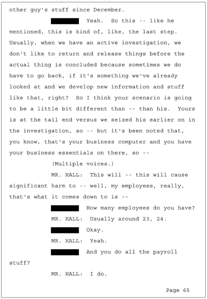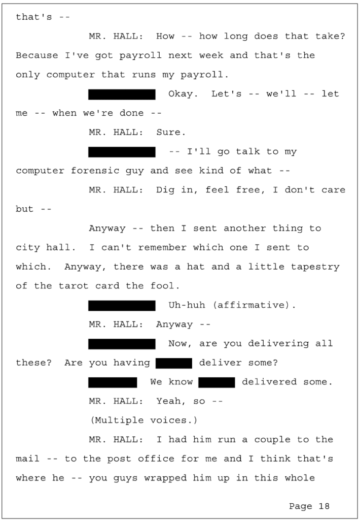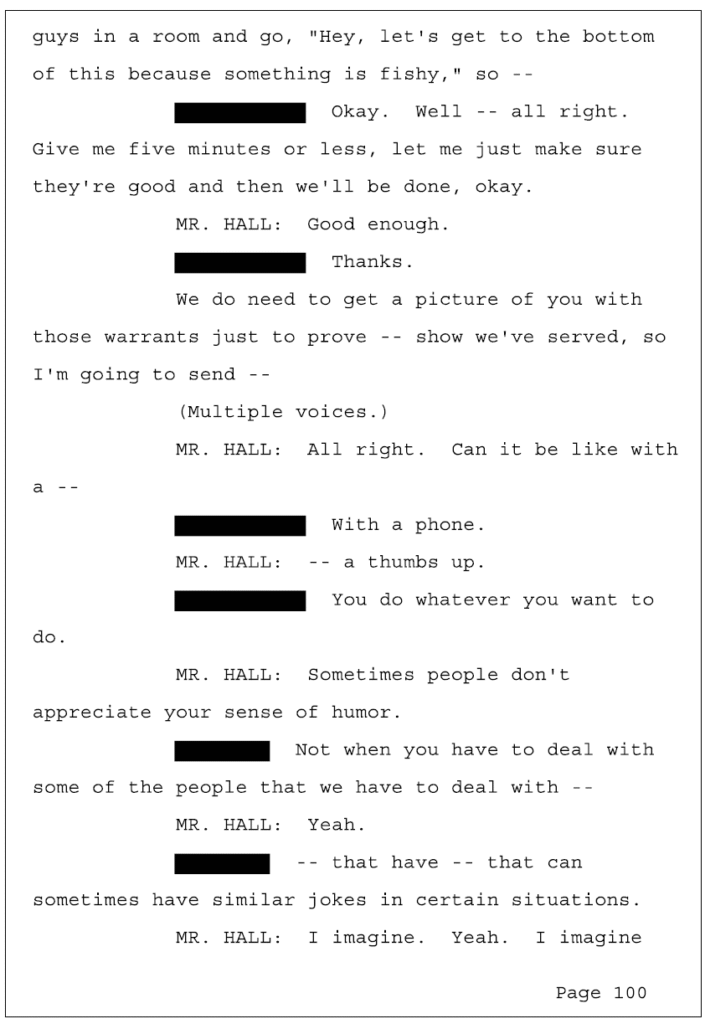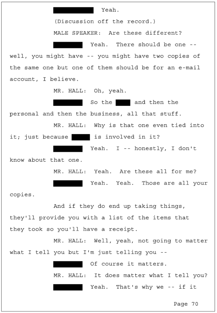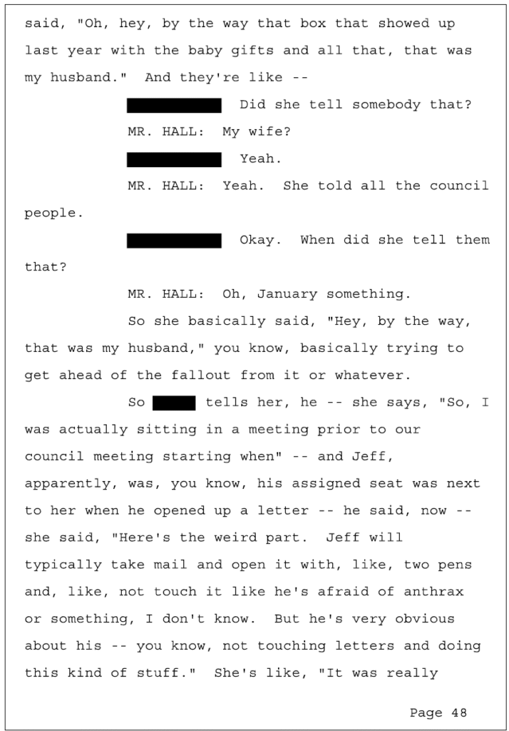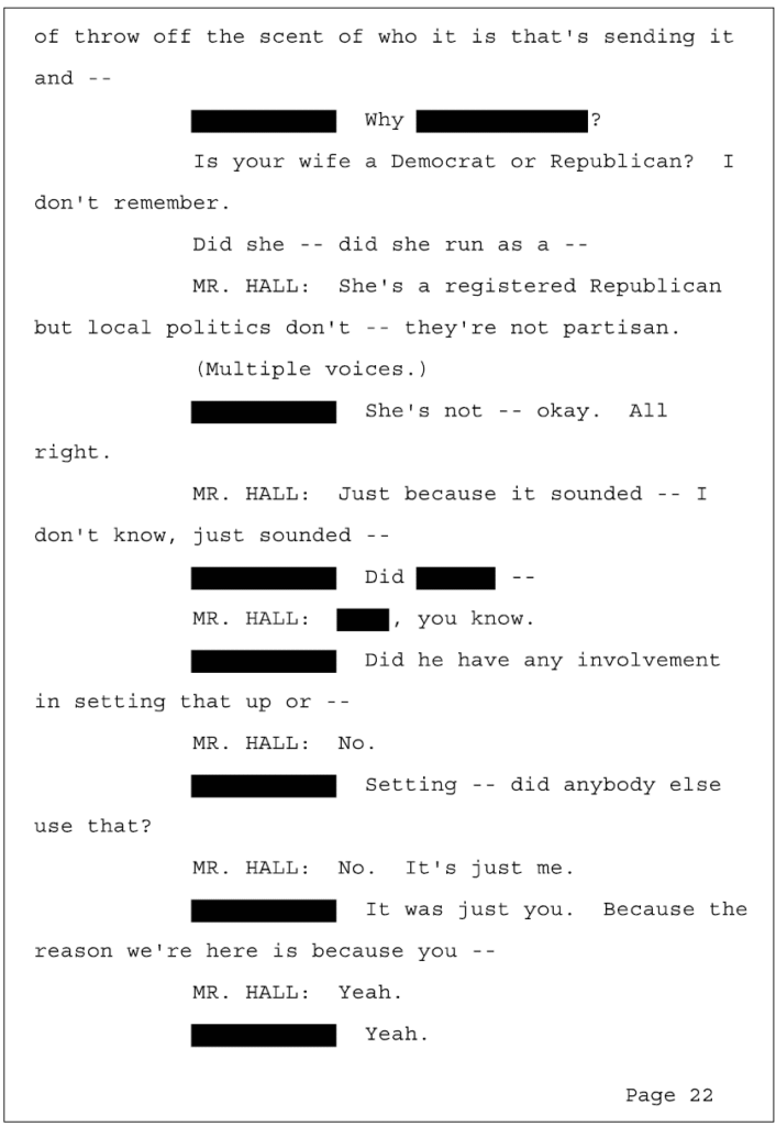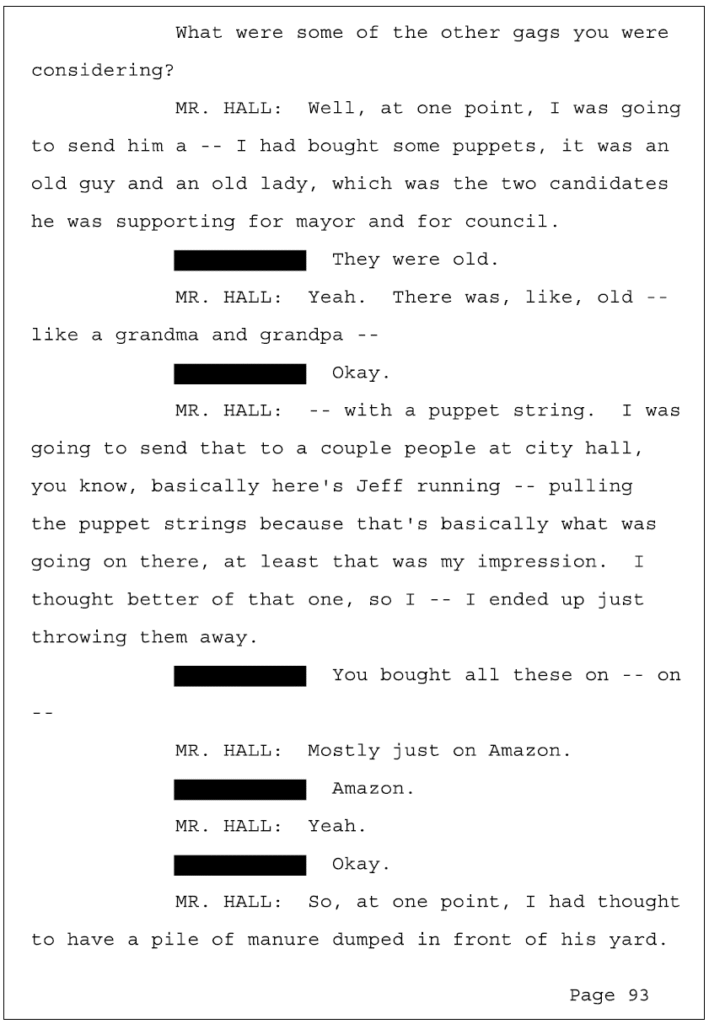 - 2 March 2022 Complete transcript of the interview two officers conducted with Jason Hall. This transcript was later suppressed from evidence in this case due to the officers’ failing to clarify Hall’s equivocal response of “potentially,” when asked if Hall would be willing to answer questions. In this interview, Jason Hall admits to sending the emails but denies sending threats in emails or letters.