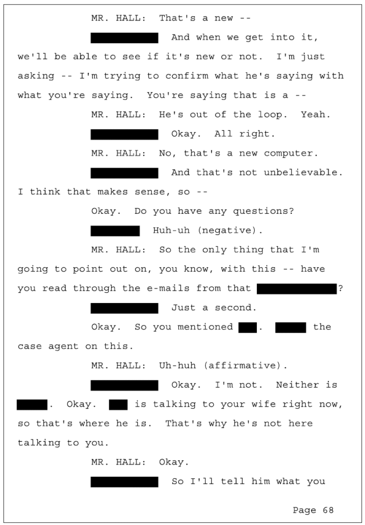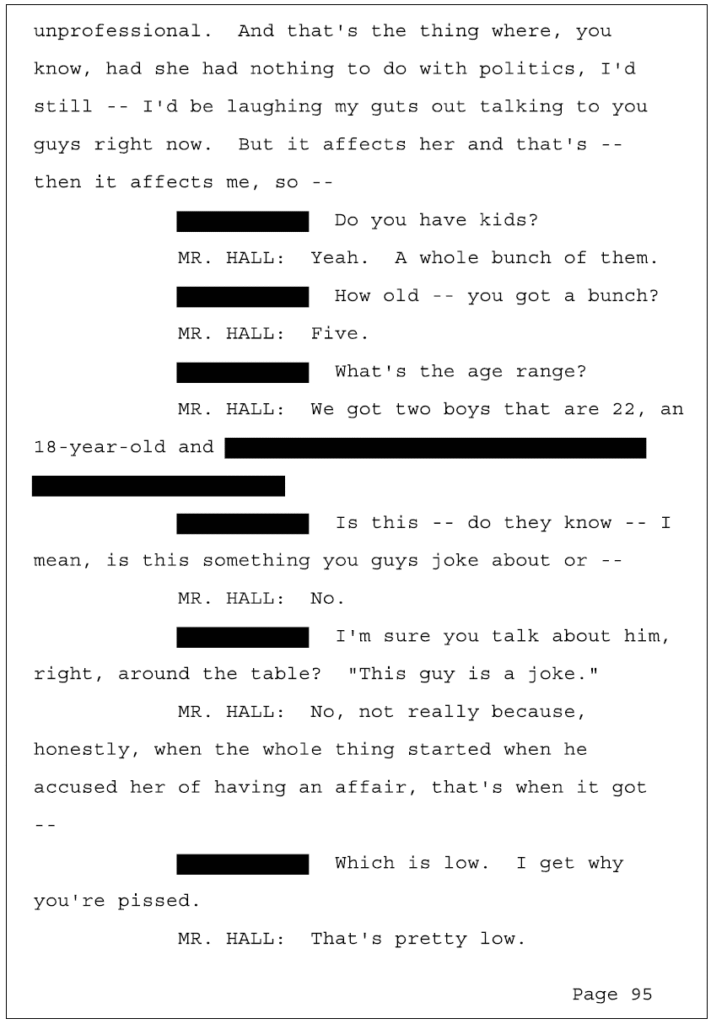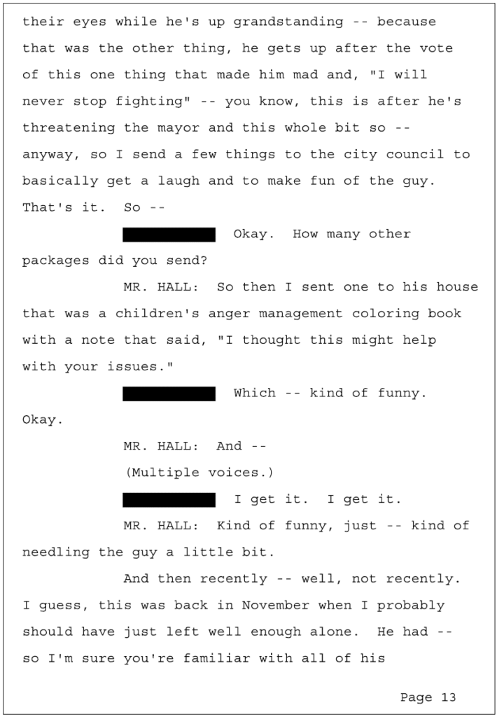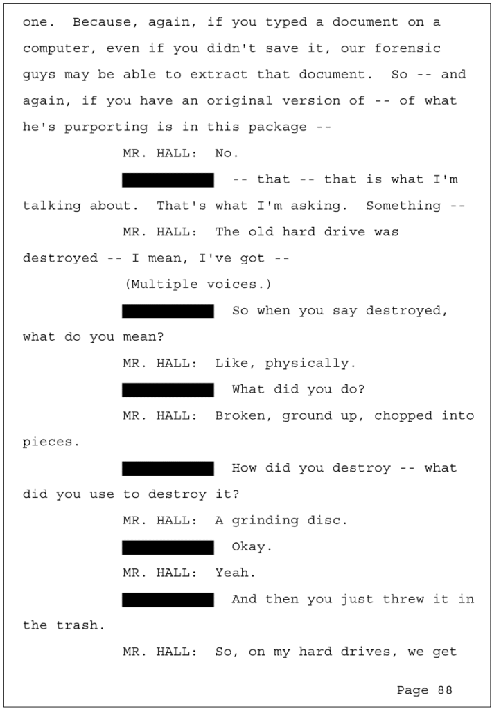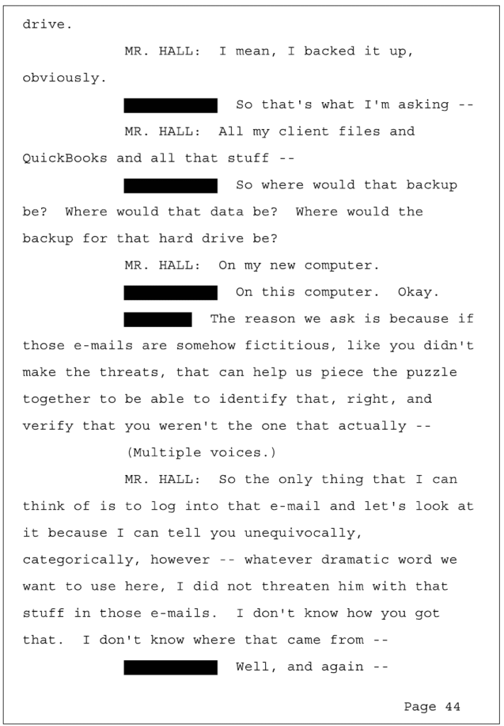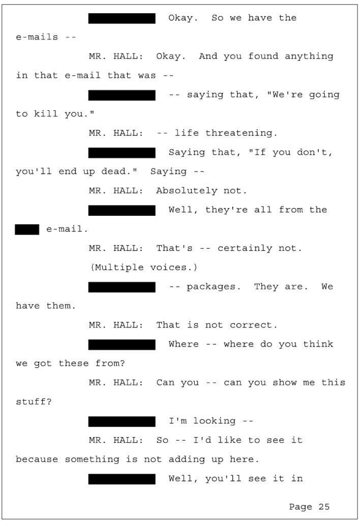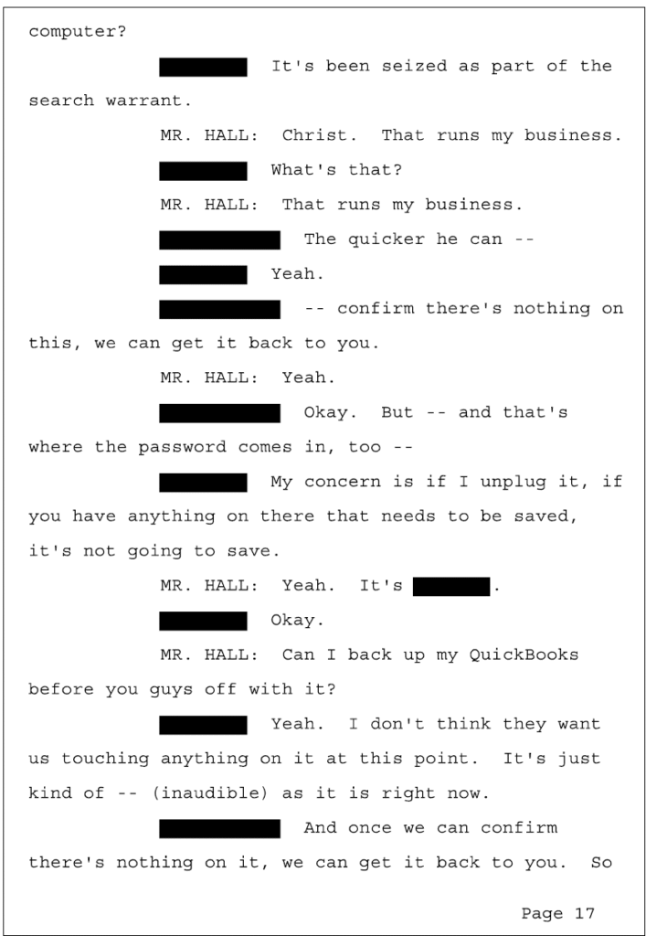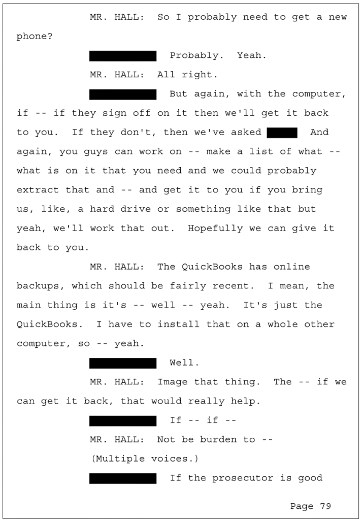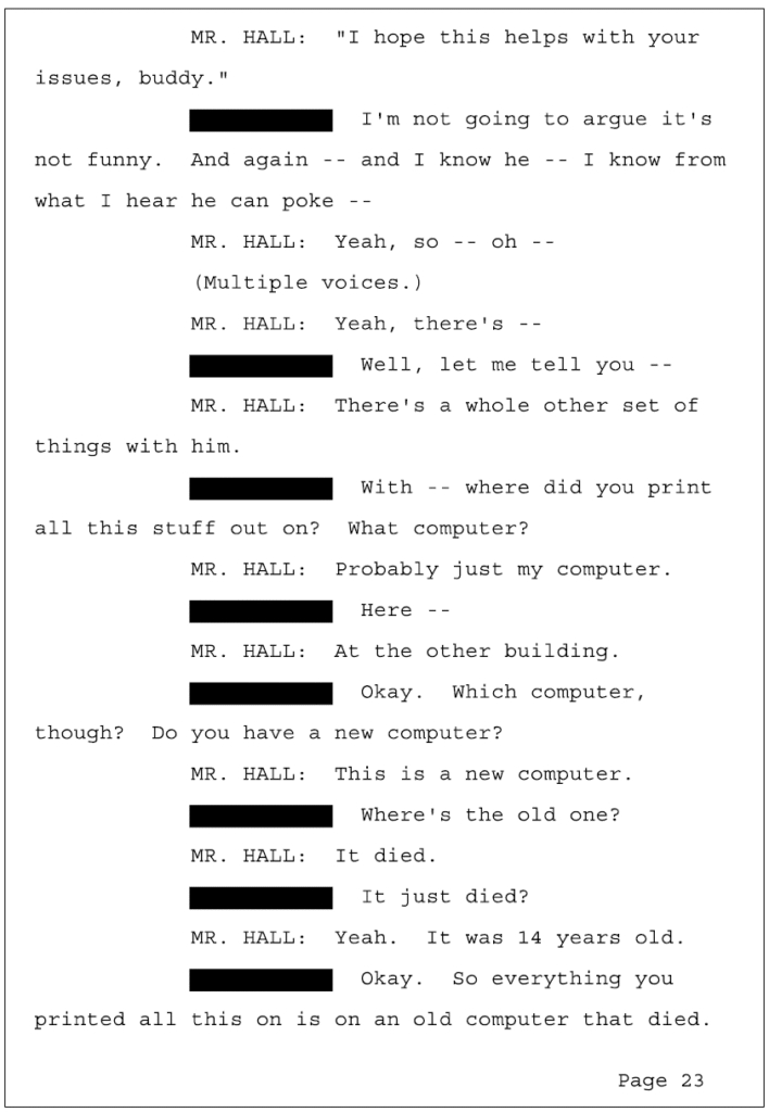 - 2 March 2022 Complete transcript of the interview two officers conducted with Jason Hall. This transcript was later suppressed from evidence in this case due to the officers’ failing to clarify Hall’s equivocal response of “potentially,” when asked if Hall would be willing to answer questions. In this interview, Jason Hall admits to sending the emails but denies sending threats in emails or letters.