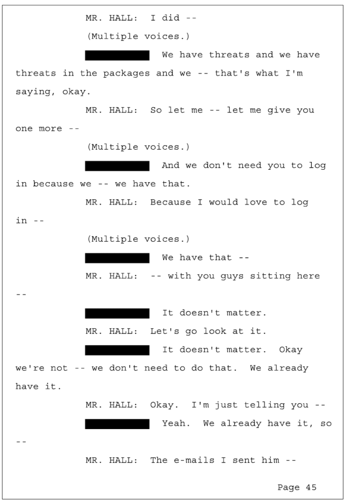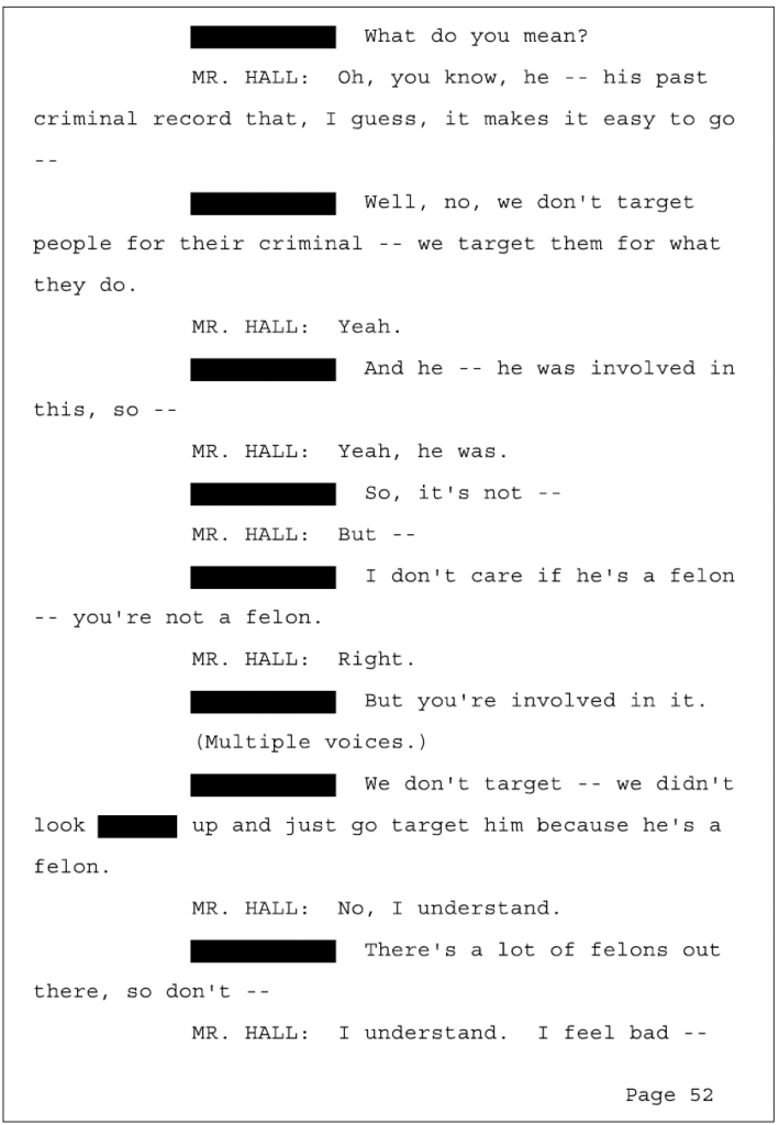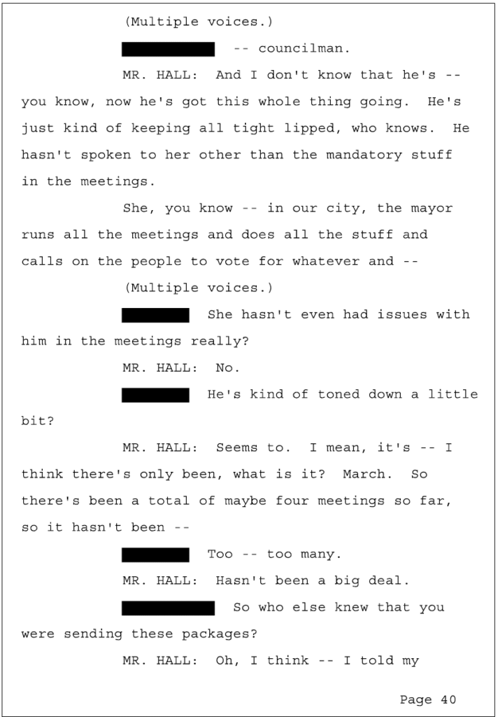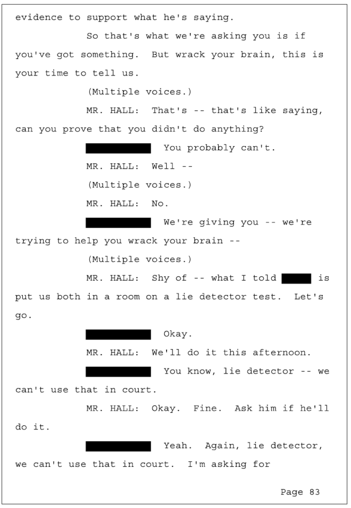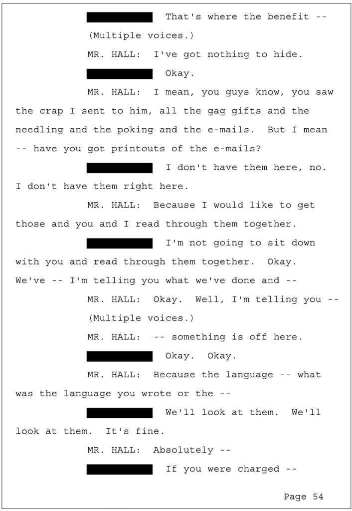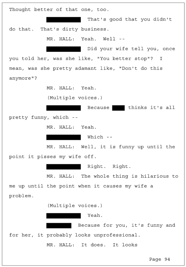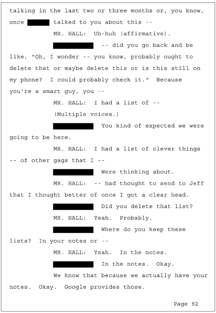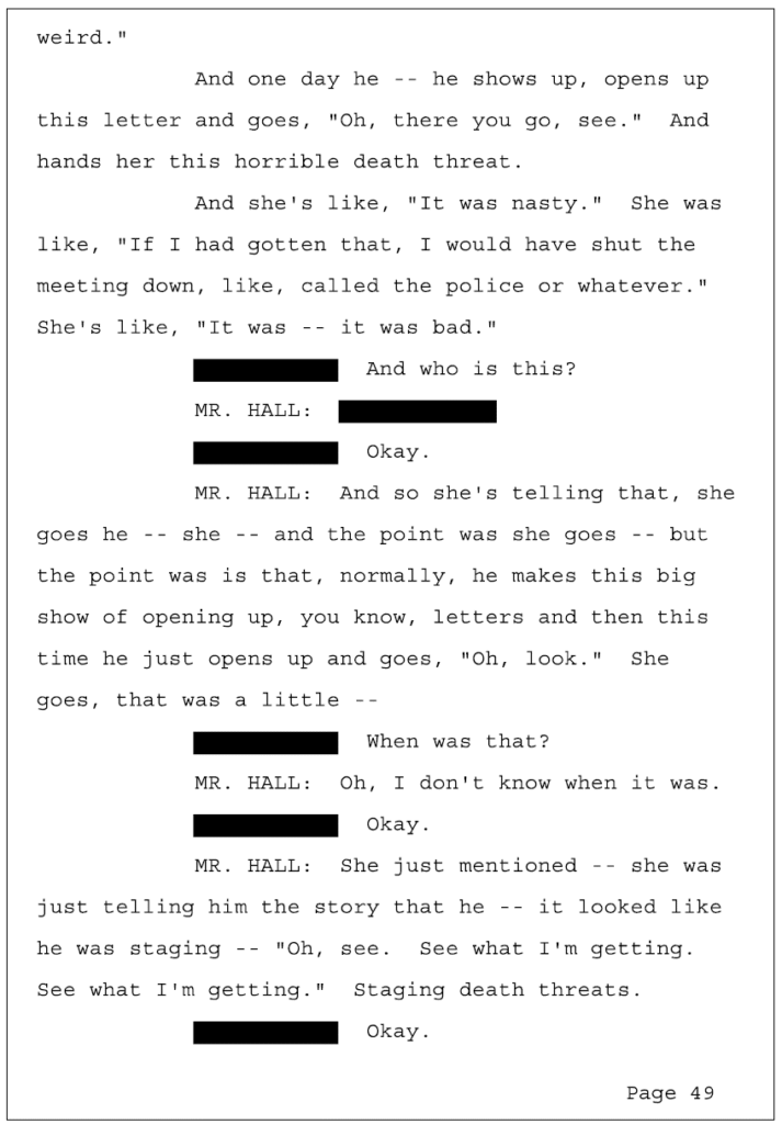 - 2 March 2022 Complete transcript of the interview two officers conducted with Jason Hall. This transcript was later suppressed from evidence in this case due to the officers’ failing to clarify Hall’s equivocal response of “potentially,” when asked if Hall would be willing to answer questions. In this interview, Jason Hall admits to sending the emails but denies sending threats in emails or letters.
