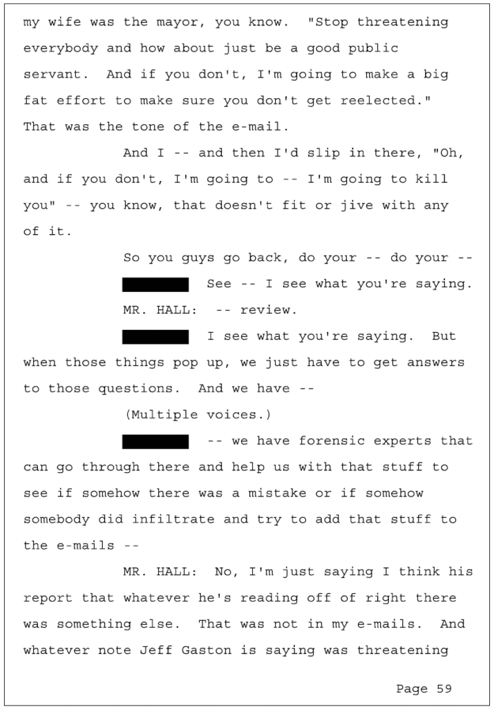14 June 2021 Email to Jeff Gaston with the words, “You think you know how to run dirty tricks to put your opponents at a disadvantage. You have no idea what you’re up against” and, “You’ll be putting your house for sale by the time we’re done.” Sent from cpacbluffdale@gmail.com. Jason Hall later admitted to sending this email.