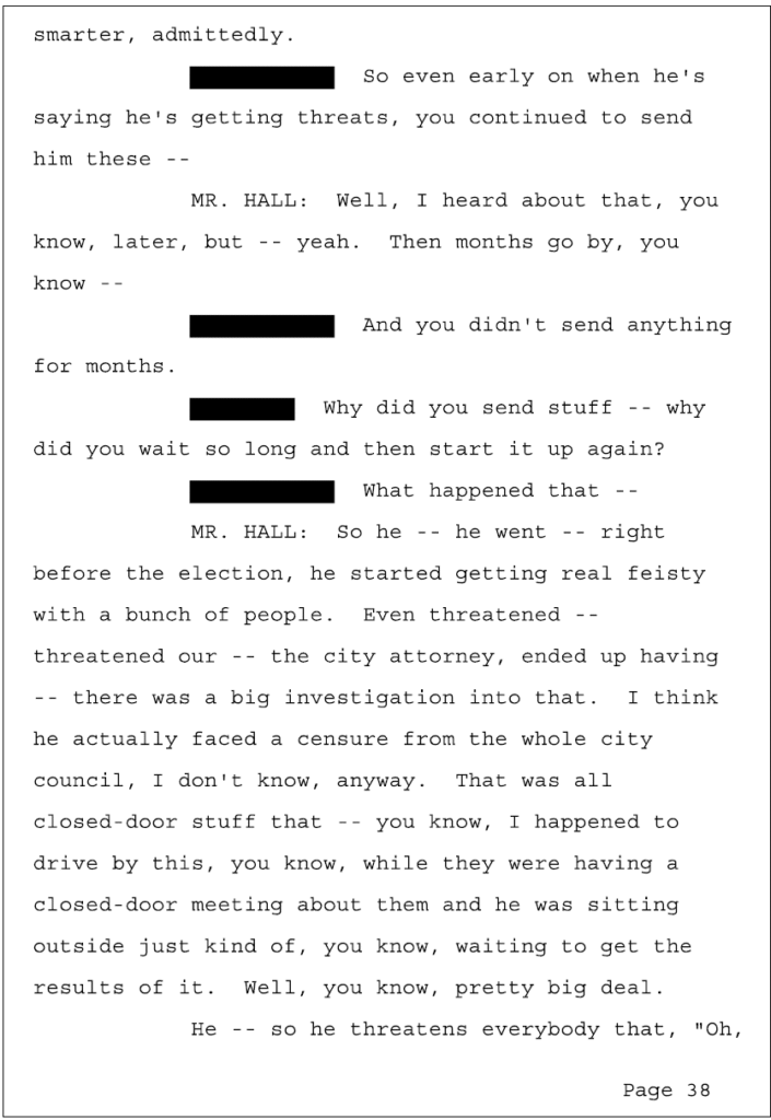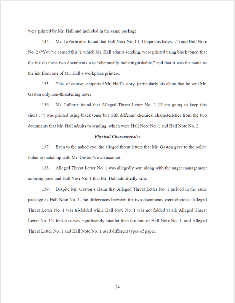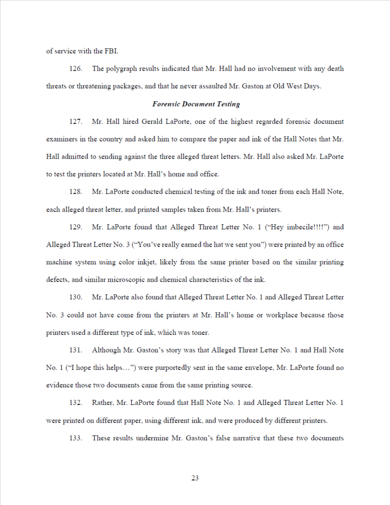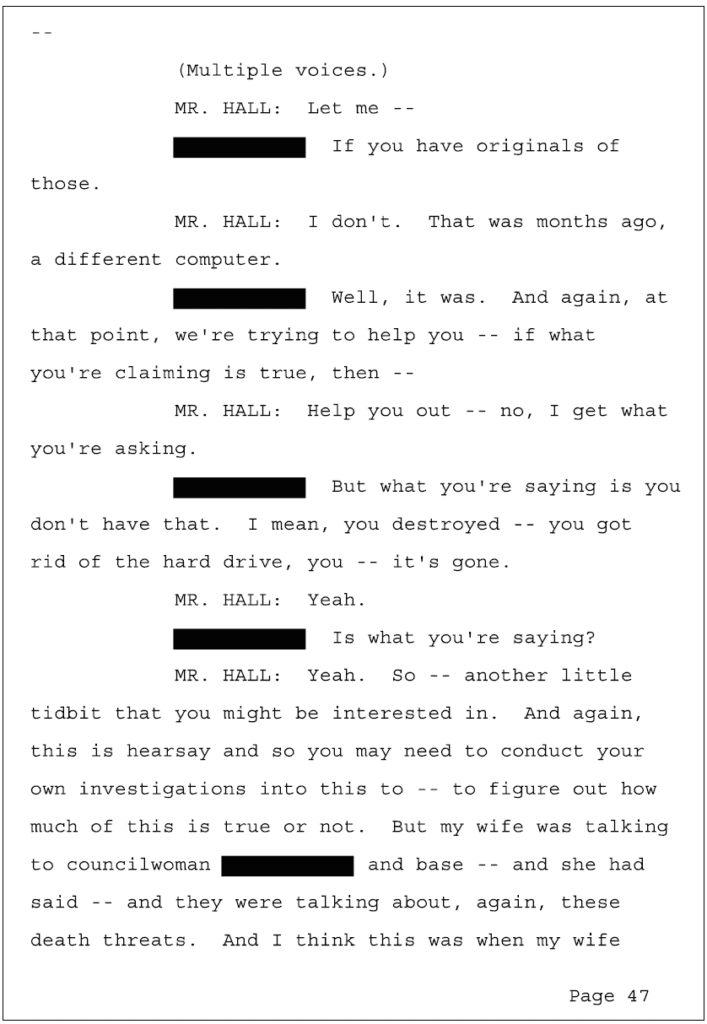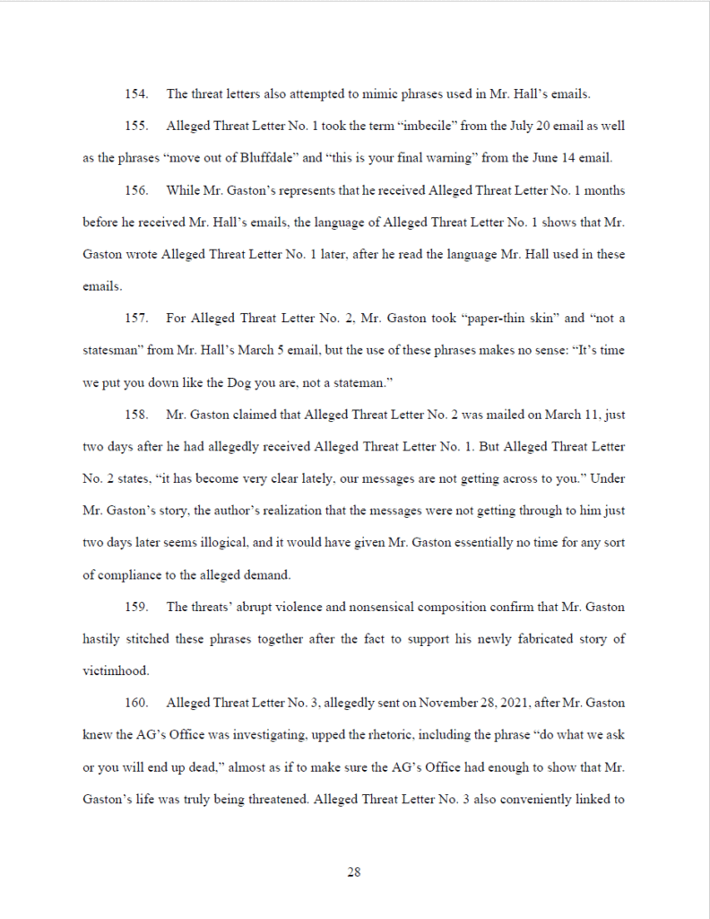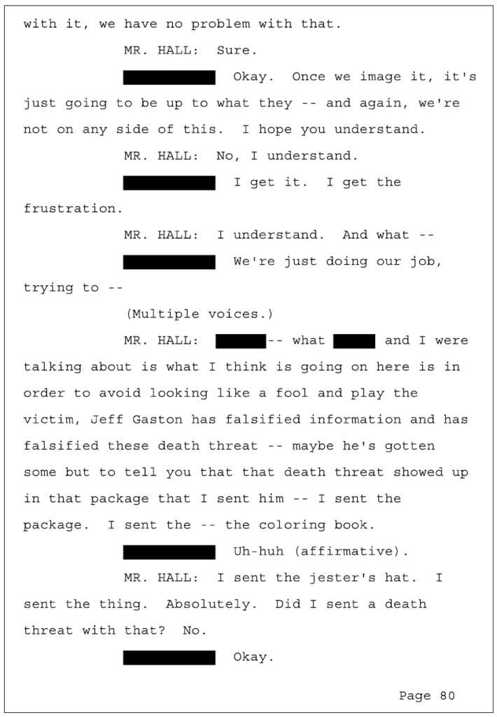 - 2 December 2020 to 20 December 2021 Forensics report made on April 12, 2022 of texting on Jason Hall’s cell phone, including several texts regarding Jeff Gaston.