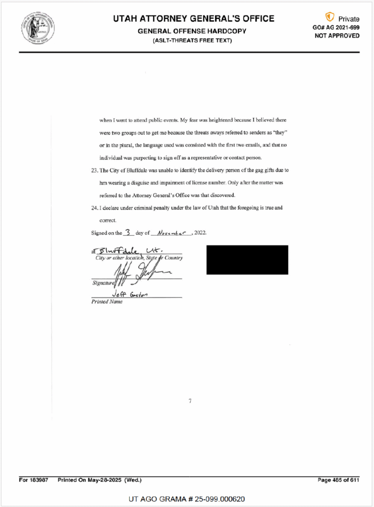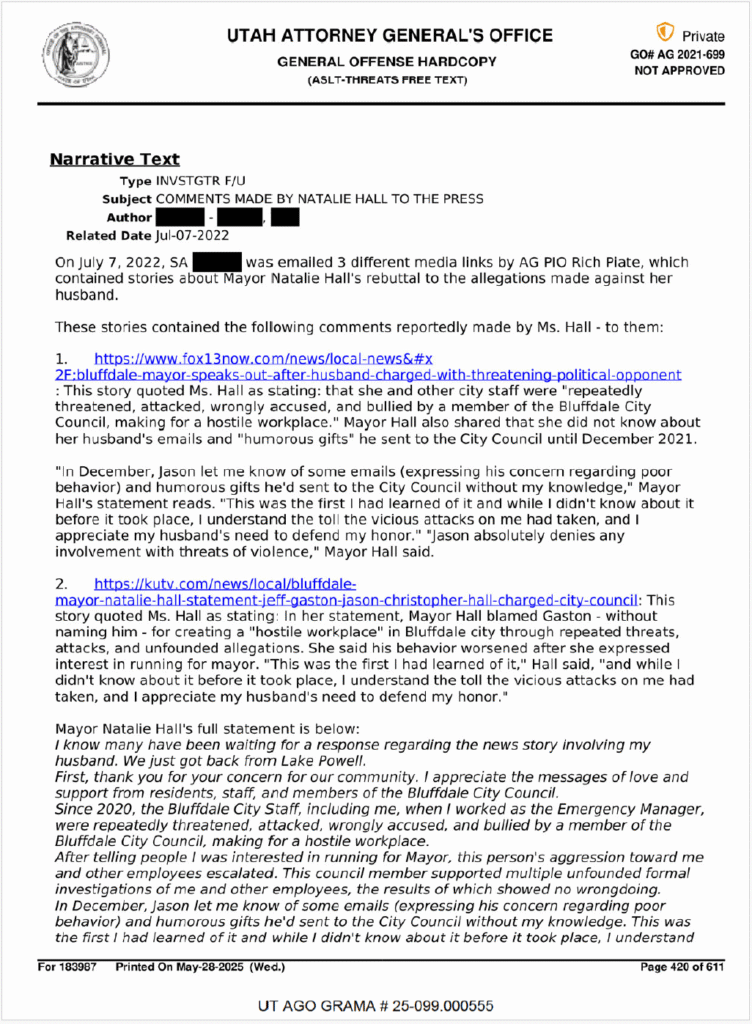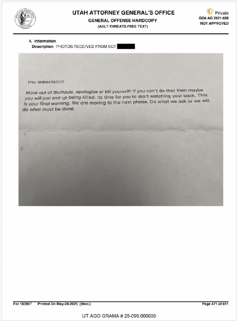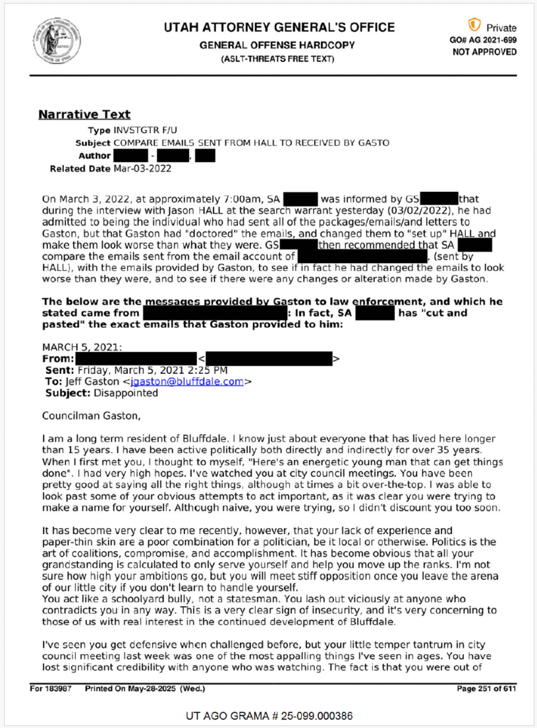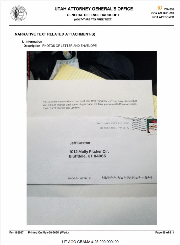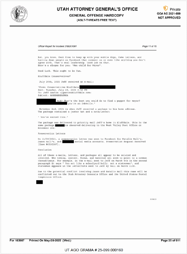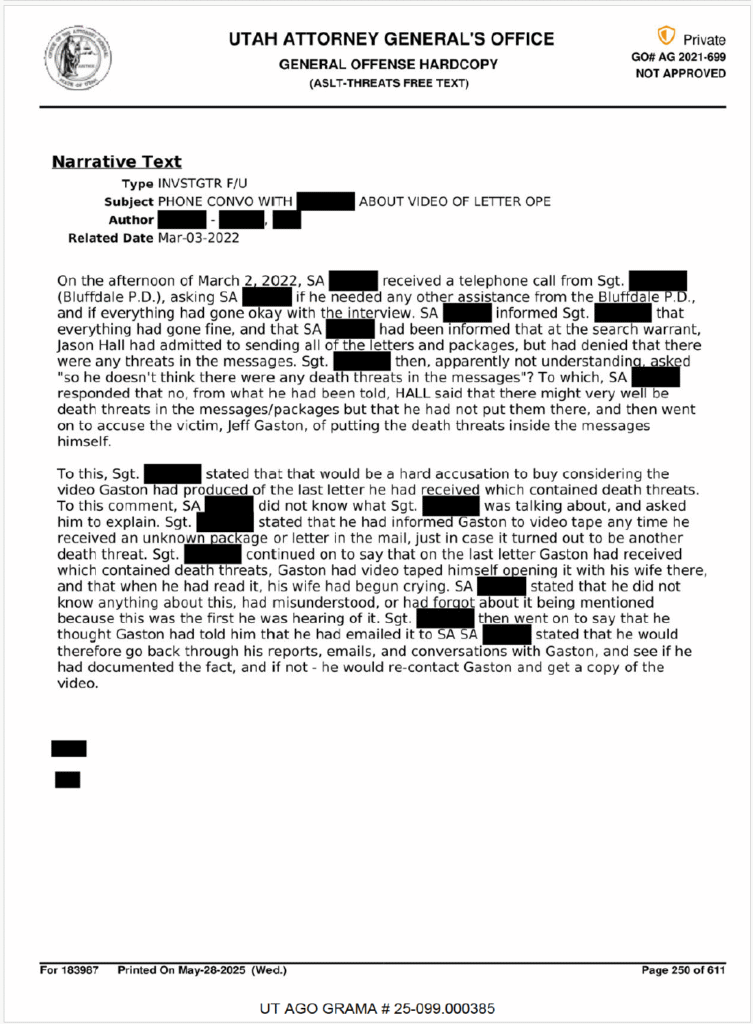 - 1 November to 3 November 2023 Emails between Bluffdale City Police and the Utah Attorney General’s Office stating that Jeff Gaston gave the police the two March 2022 threat letters within a couple of days of receiving them, directly refuting Natalie and Jason Hall’s claim that he waited 8 months