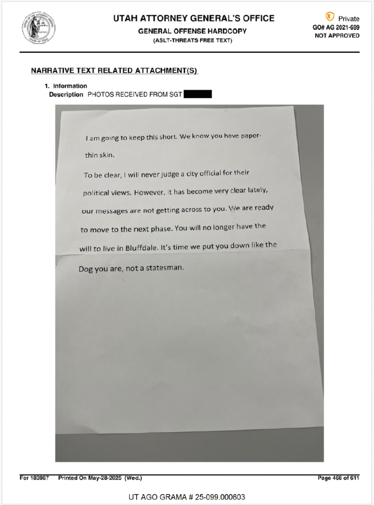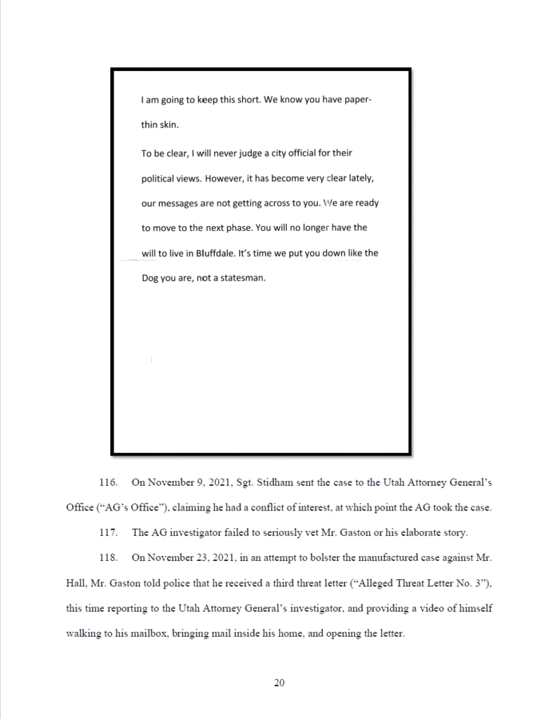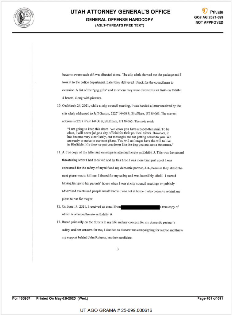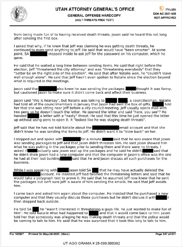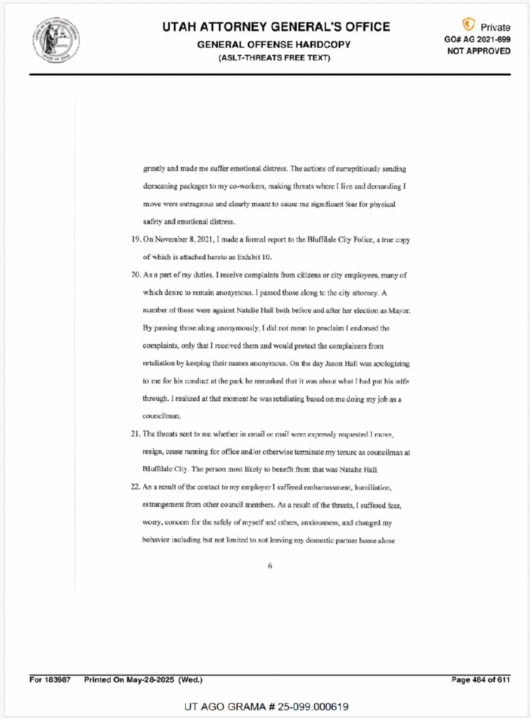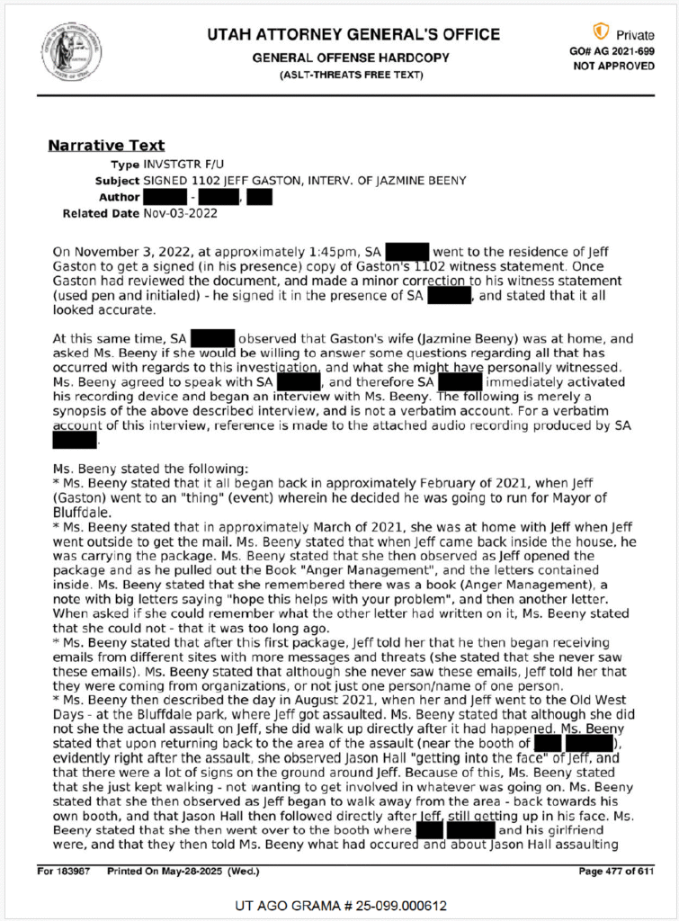 - 1 November to 3 November 2023 Emails between Bluffdale City Police and the Utah Attorney General’s Office stating that Jeff Gaston gave the police the two March 2022 threat letters within a couple of days of receiving them, directly refuting Natalie and Jason Hall’s claim that he waited 8 months