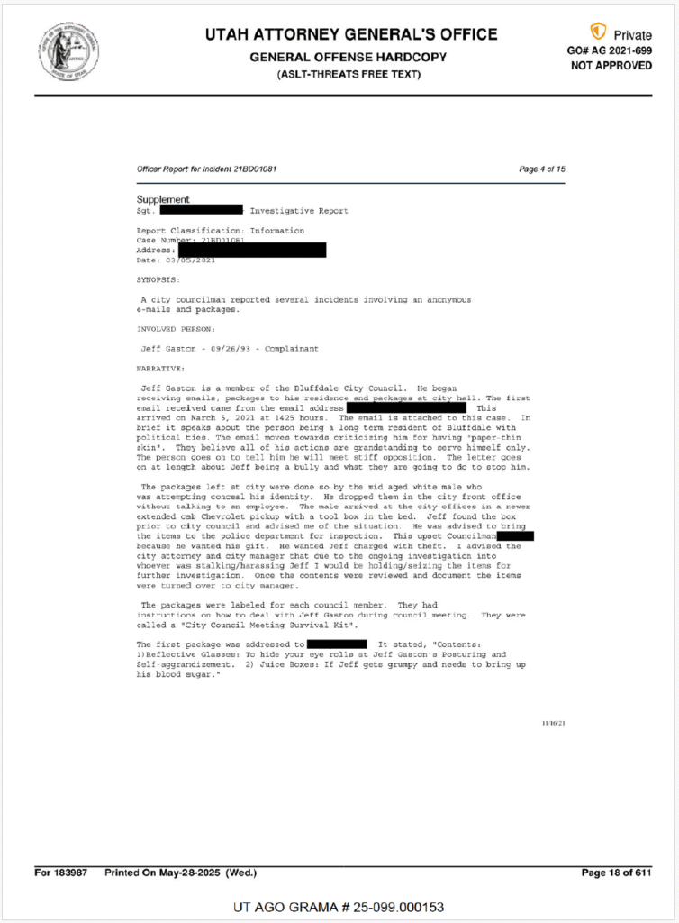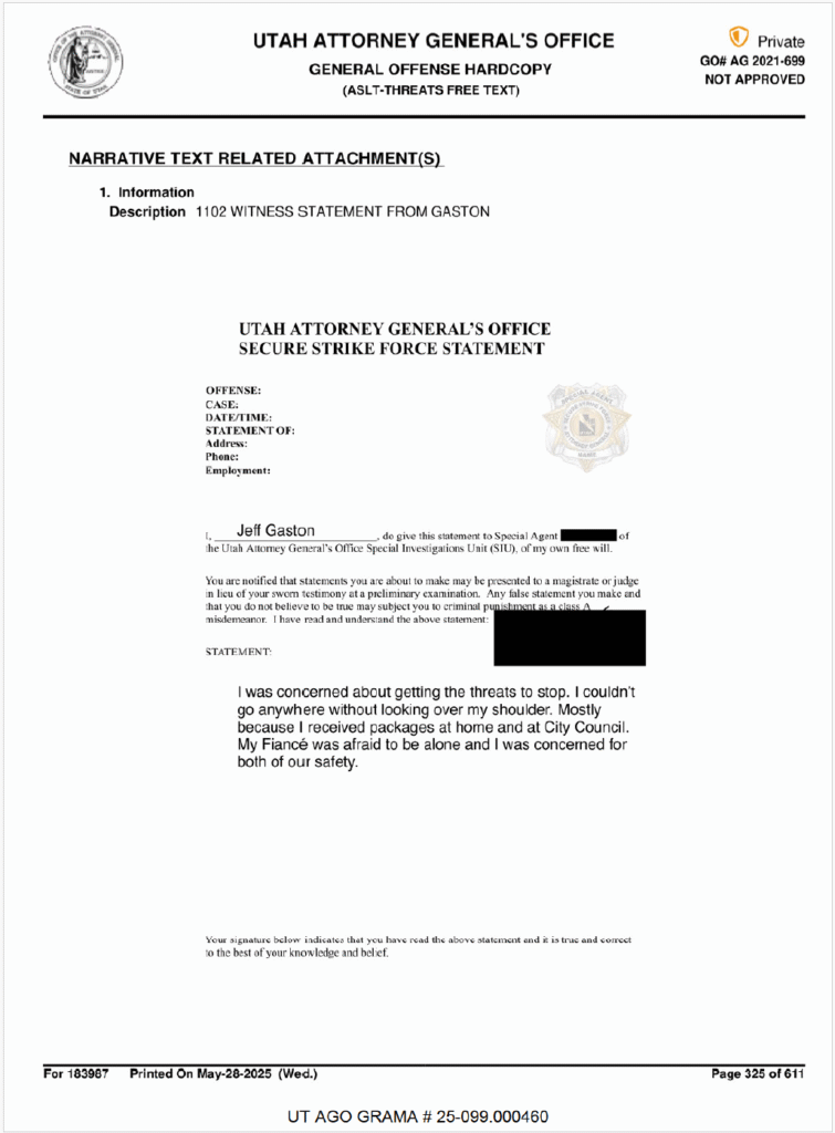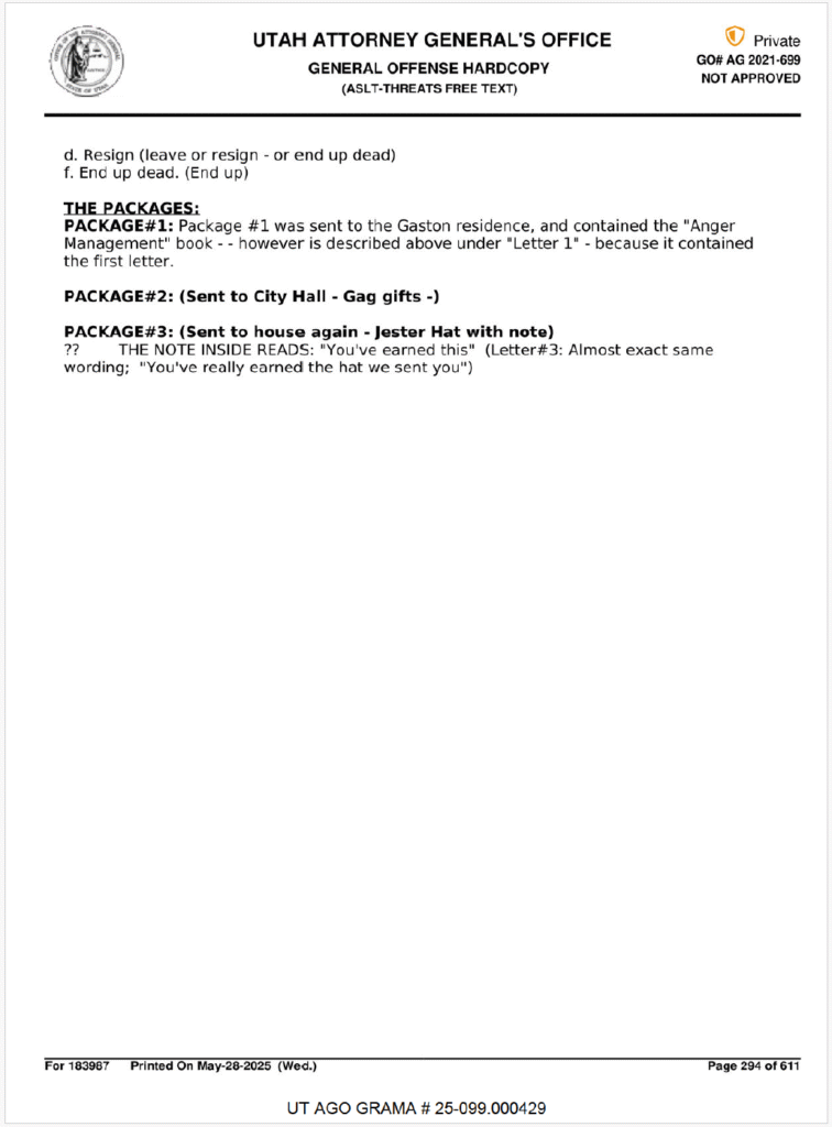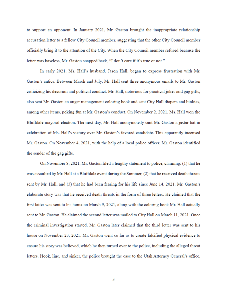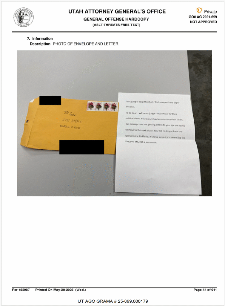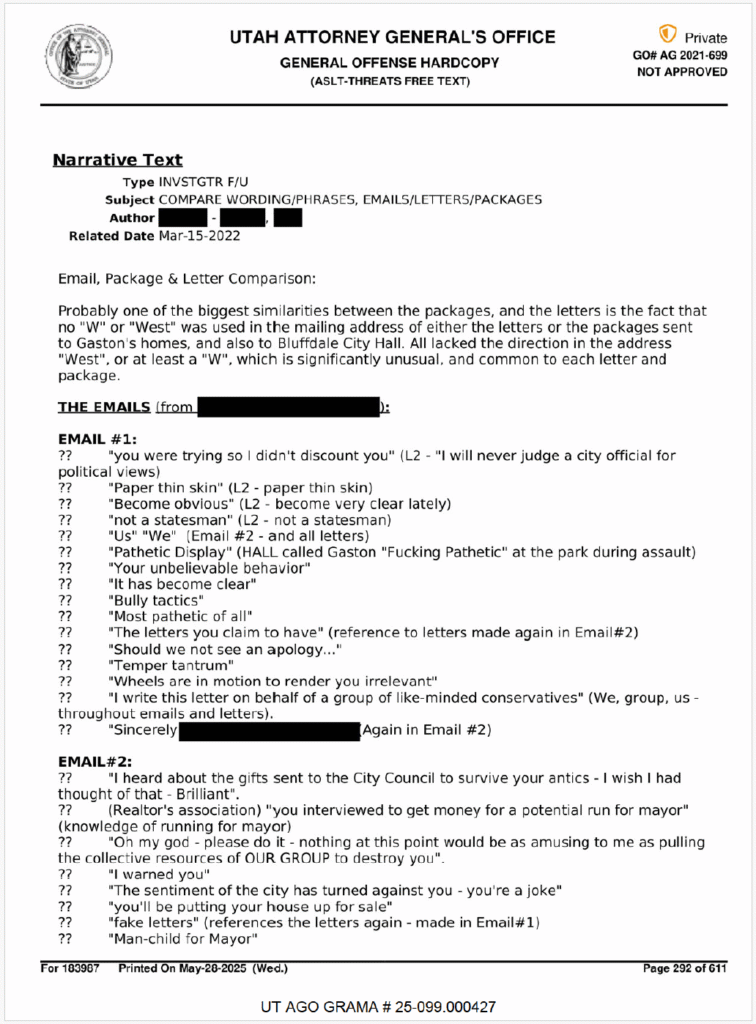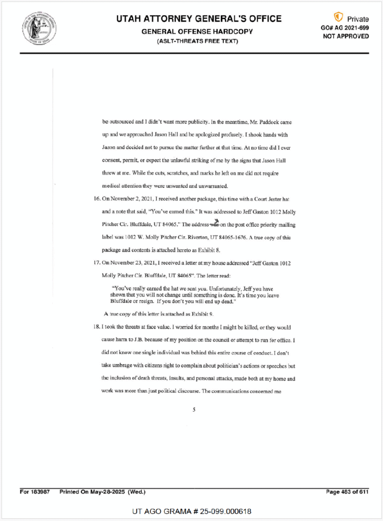 - 1 November to 3 November 2023 Emails between Bluffdale City Police and the Utah Attorney General’s Office stating that Jeff Gaston gave the police the two March 2022 threat letters within a couple of days of receiving them, directly refuting Natalie and Jason Hall’s claim that he waited 8 months