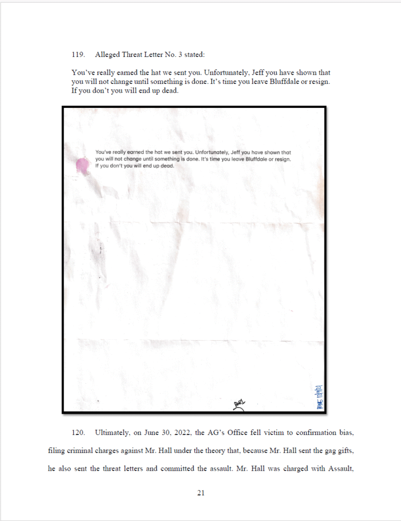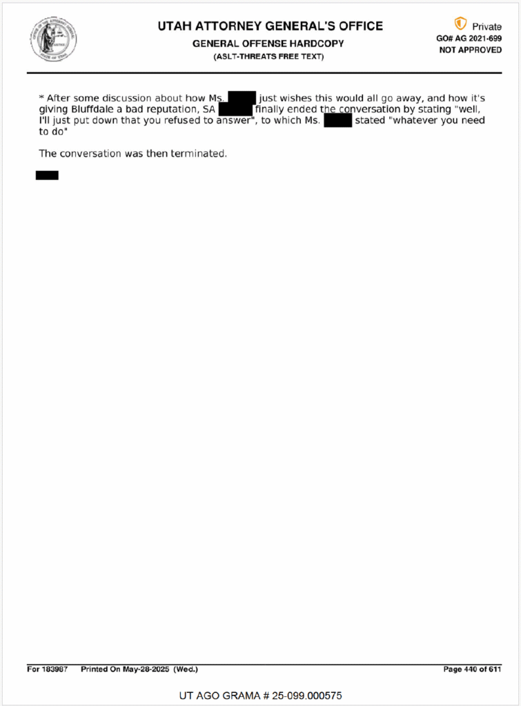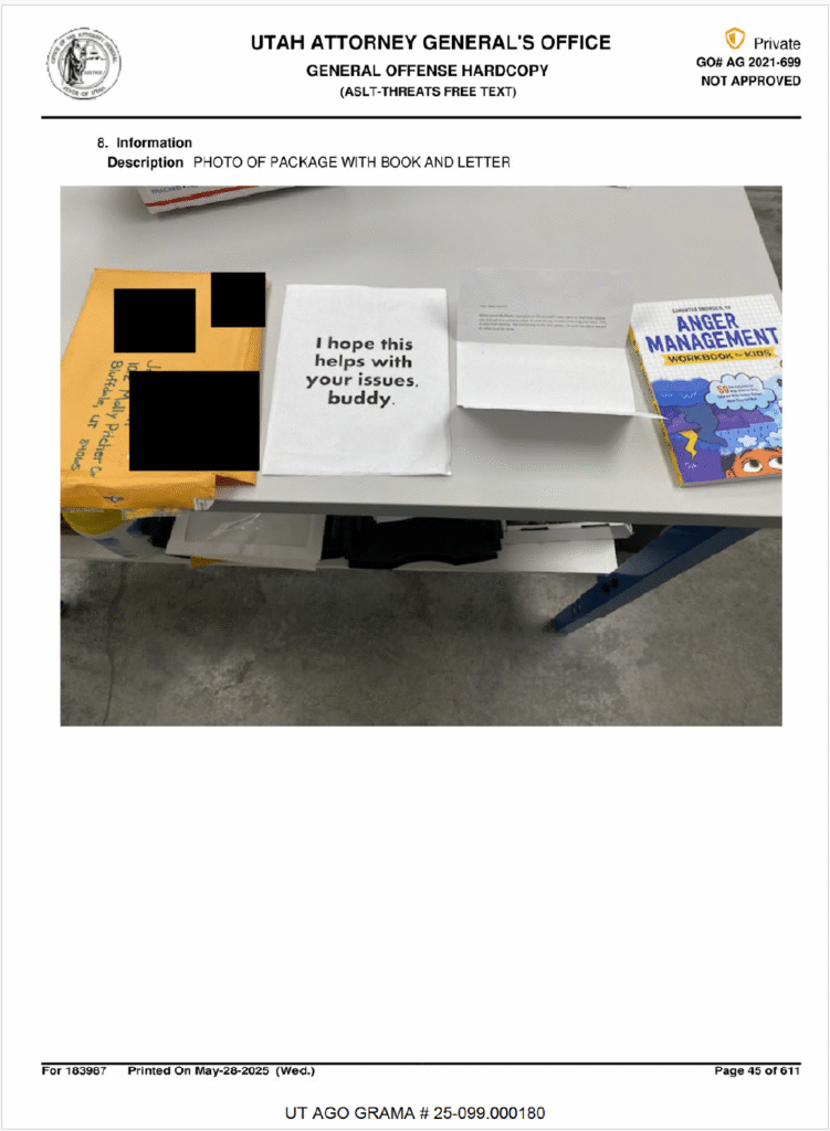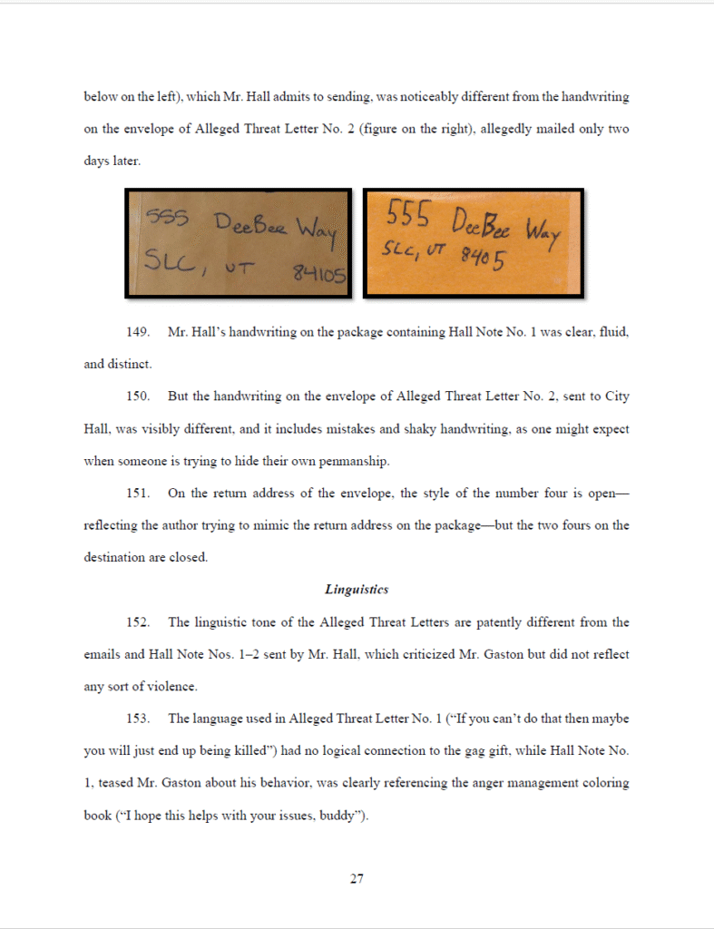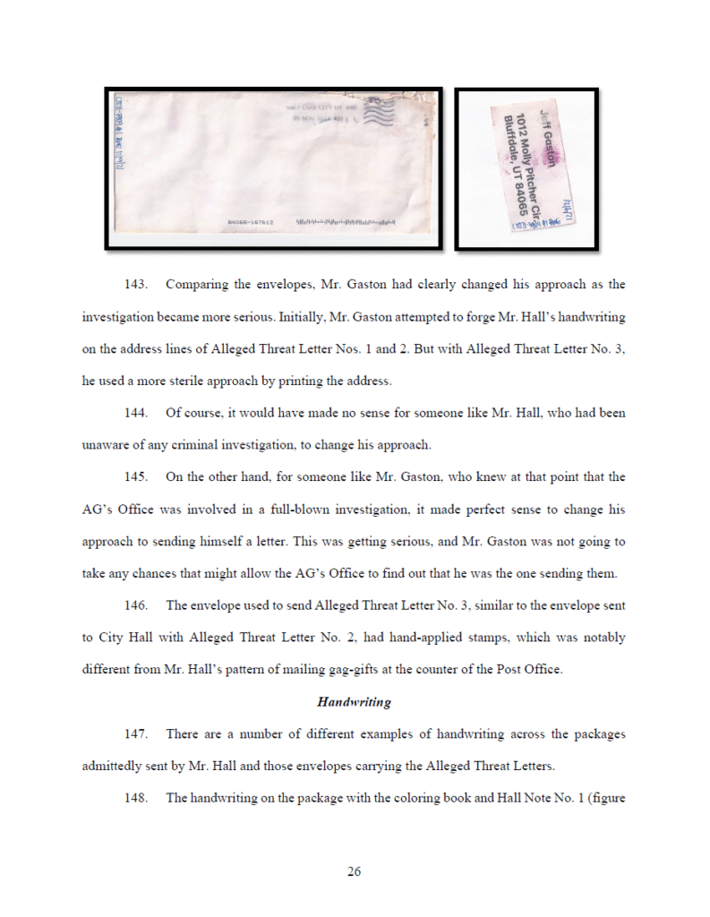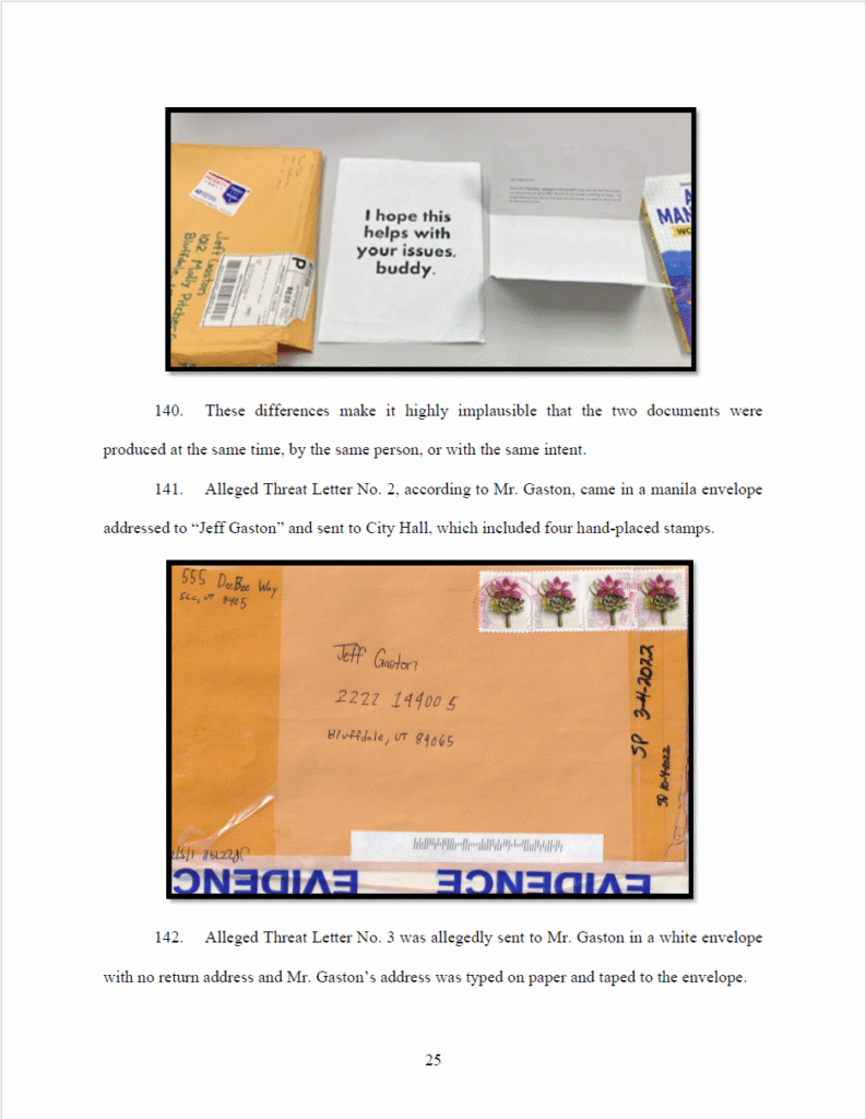 - 1 November to 3 November 2023 Emails between Bluffdale City Police and the Utah Attorney General’s Office stating that Jeff Gaston gave the police the two March 2022 threat letters within a couple of days of receiving them, directly refuting Natalie and Jason Hall’s claim that he waited 8 months