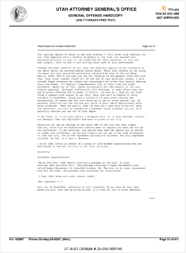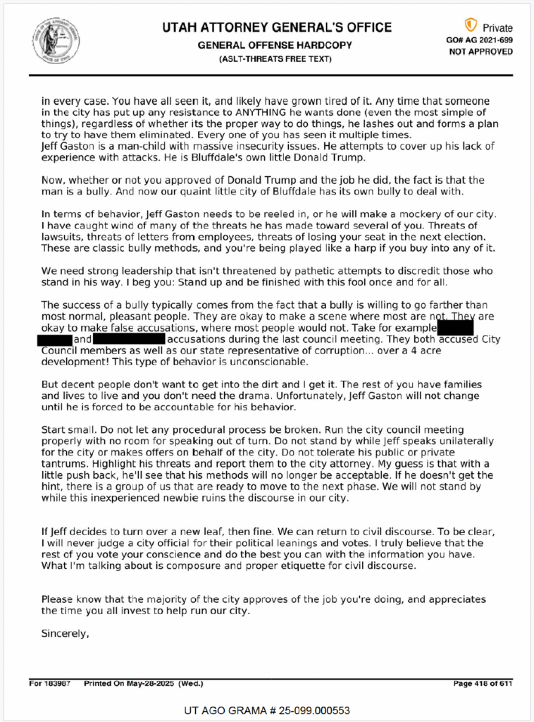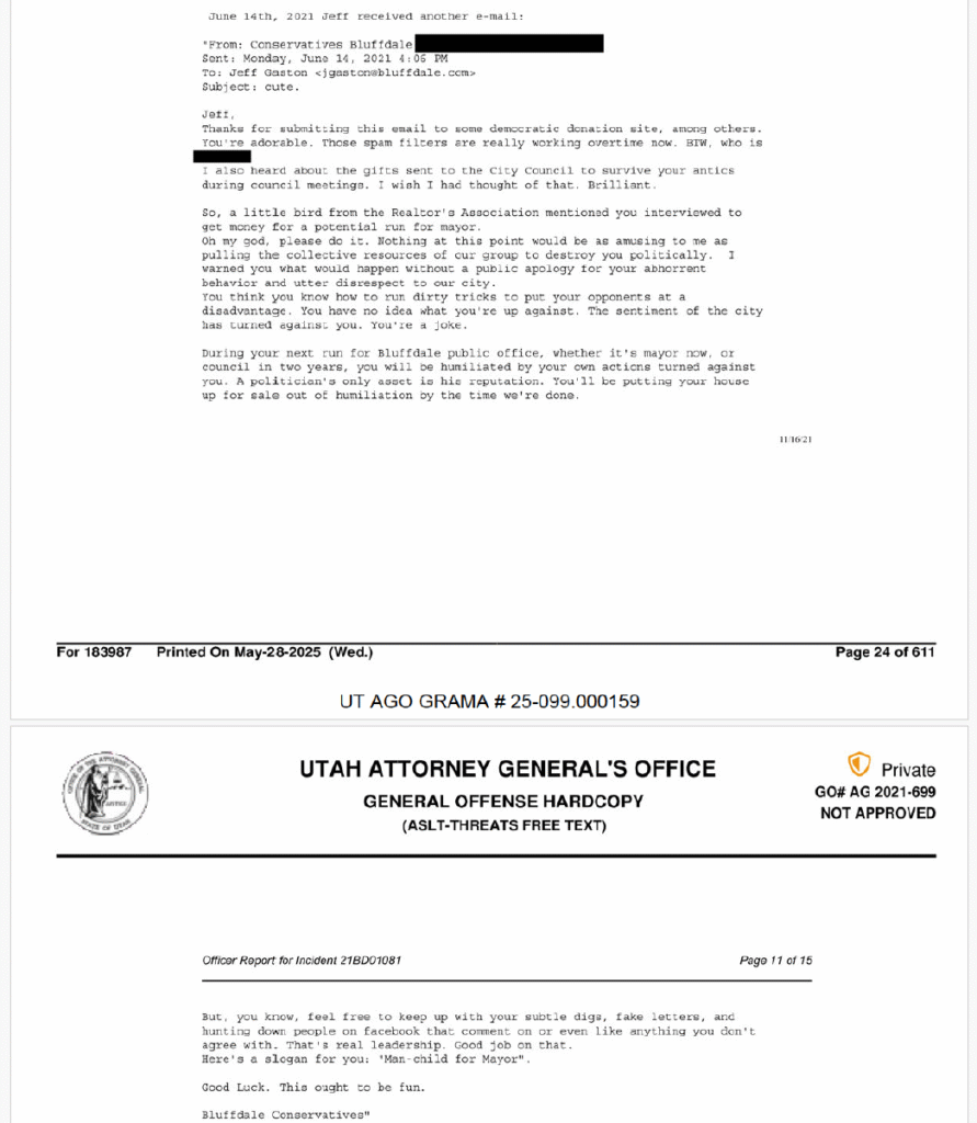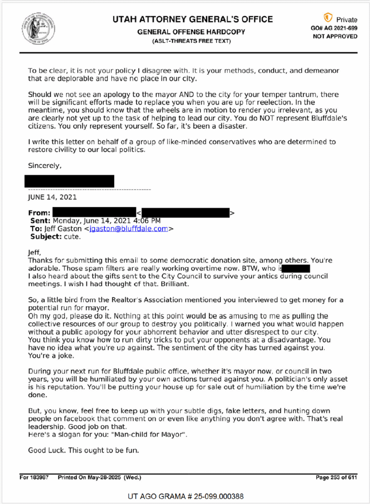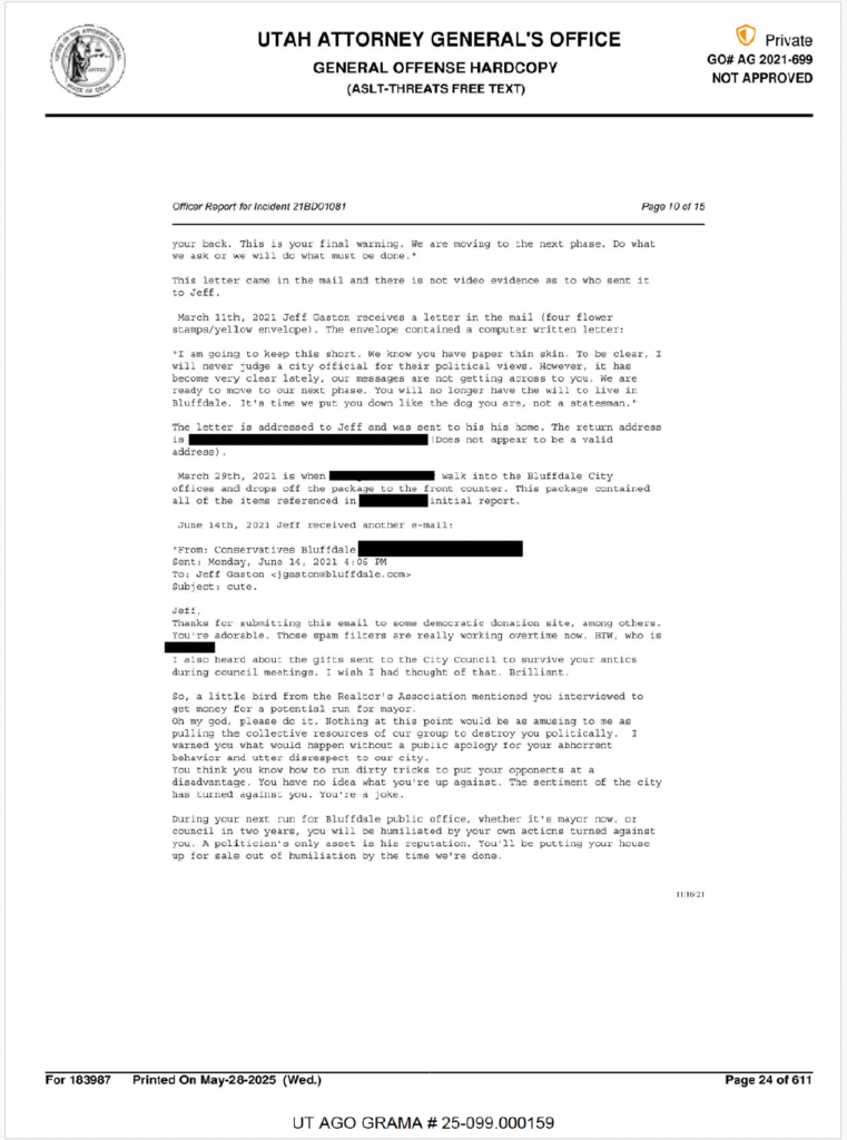 - 14 June 2021 Email to Jeff Gaston with the words, “You think you know how to run dirty tricks to put your opponents at a disadvantage. You have no idea what you’re up against” and, “You’ll be putting your house for sale by the time we’re done.” Sent from cpacbluffdale@gmail.com. Jason Hall later admitted to sending this email.