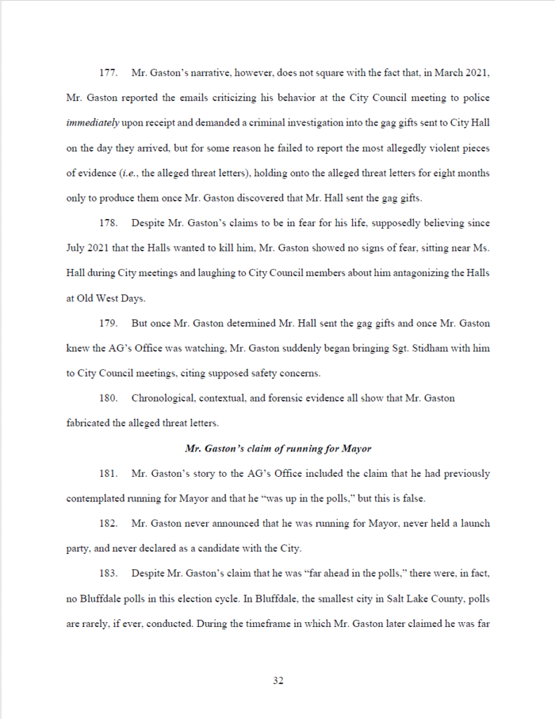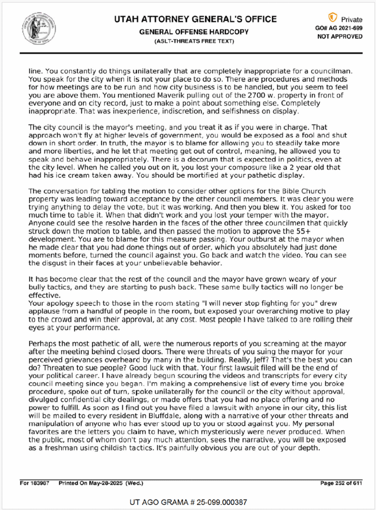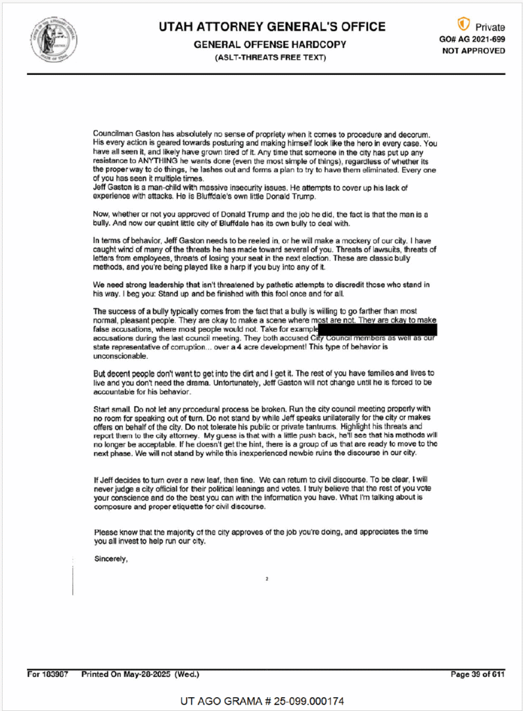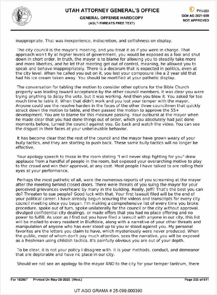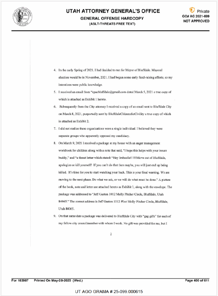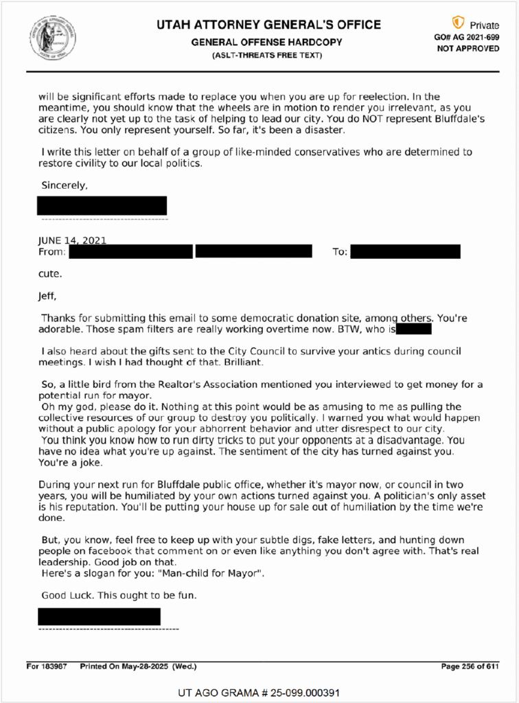 - 14 June 2021 Email to Jeff Gaston with the words, “You think you know how to run dirty tricks to put your opponents at a disadvantage. You have no idea what you’re up against” and, “You’ll be putting your house for sale by the time we’re done.” Sent from cpacbluffdale@gmail.com. Jason Hall later admitted to sending this email.
