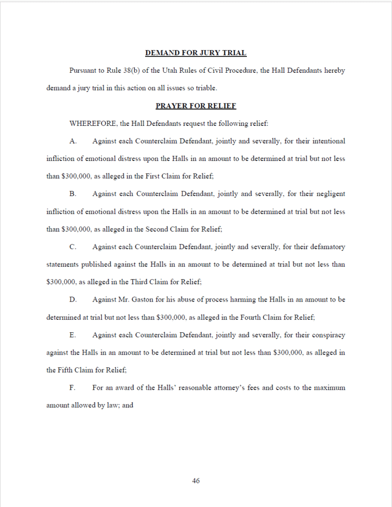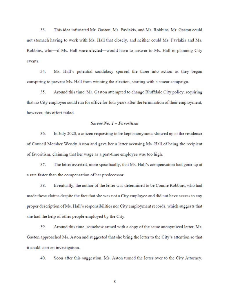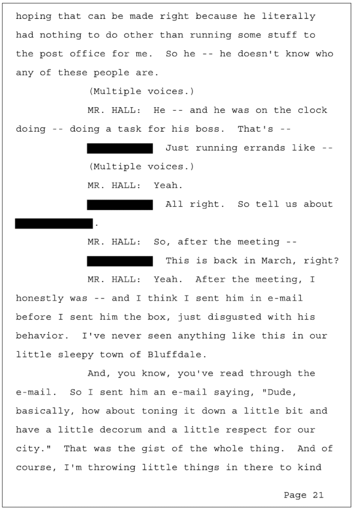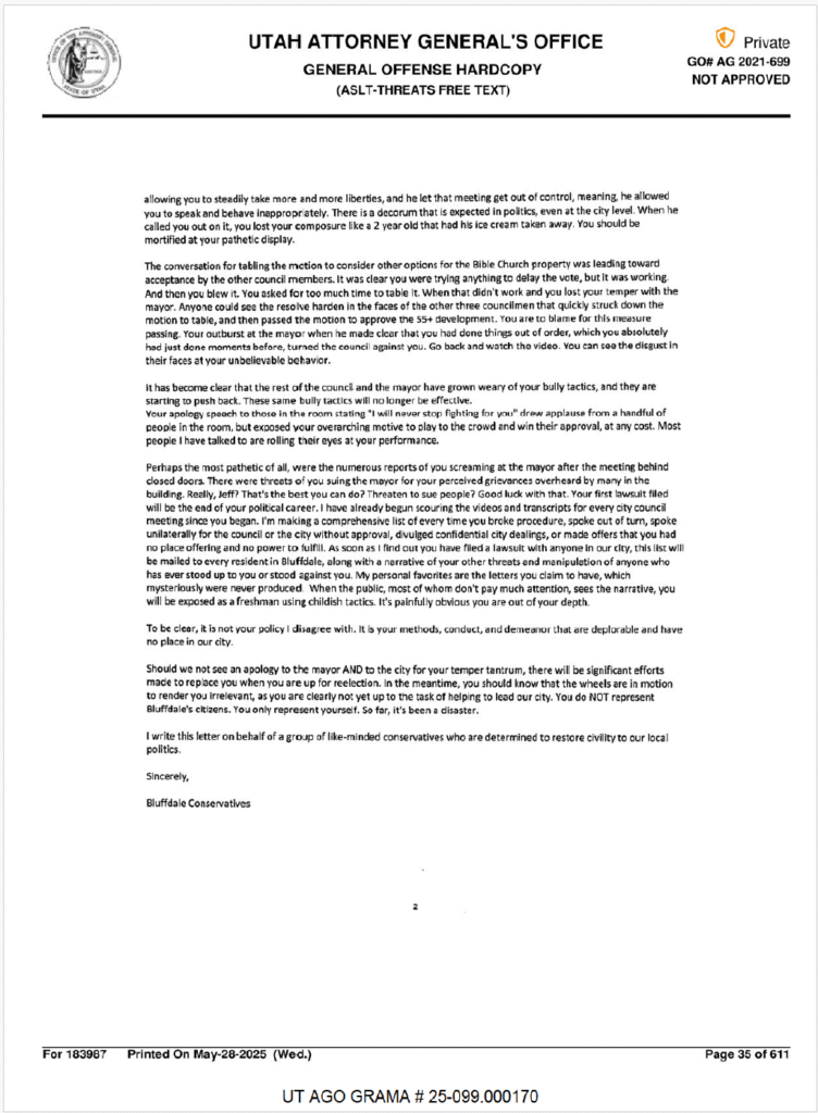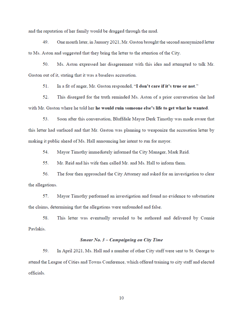 - 14 June 2021 Email to Jeff Gaston with the words, “You think you know how to run dirty tricks to put your opponents at a disadvantage. You have no idea what you’re up against” and, “You’ll be putting your house for sale by the time we’re done.” Sent from cpacbluffdale@gmail.com. Jason Hall later admitted to sending this email.