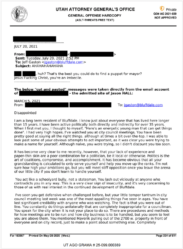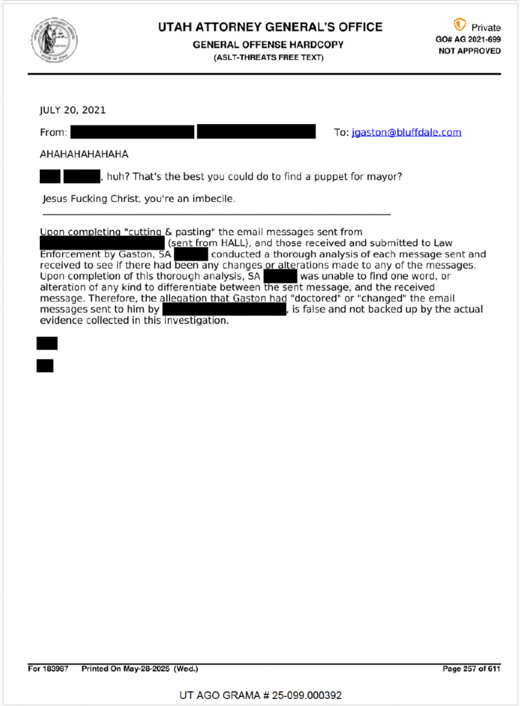 - 20 July 2021 Brief email sent to Gaston mocking him for supporting John Roberts for mayor, laced with extremely vulgar language. Sent from cpacbluffdale@gmail.com. Jason Hall later admitted to sending this email. Also, see Jason Hall’s references to Gaston running for mayor in his June 14, 2021 email sent to Gaston through the cpacbluffdale@gmail.com account.