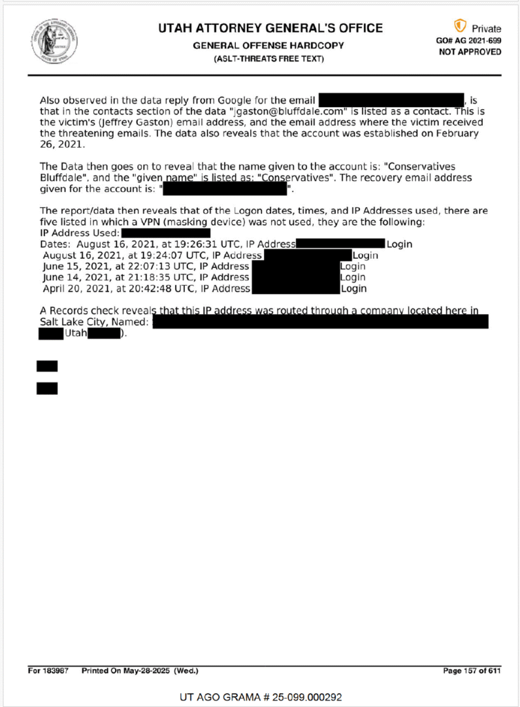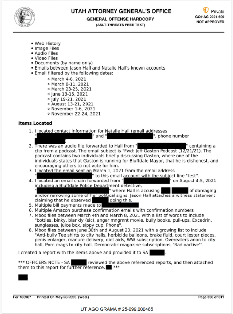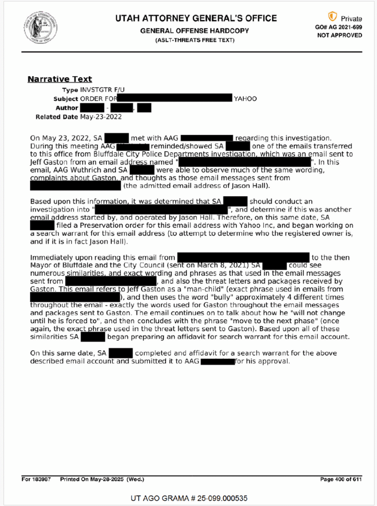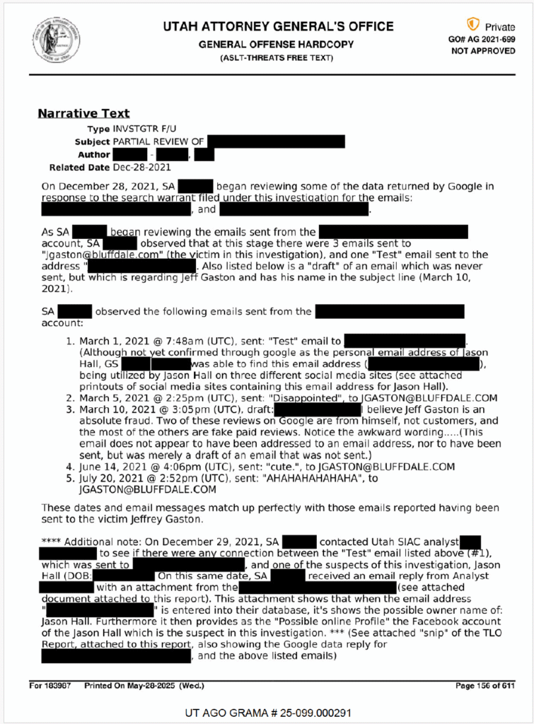- 26 May 2022 Report of the reply data for the search warrant issued to Yahoo concluding that the email address which sent the email to the Bluffdale City Council about Jeff Gaston was associated with Jason Hall