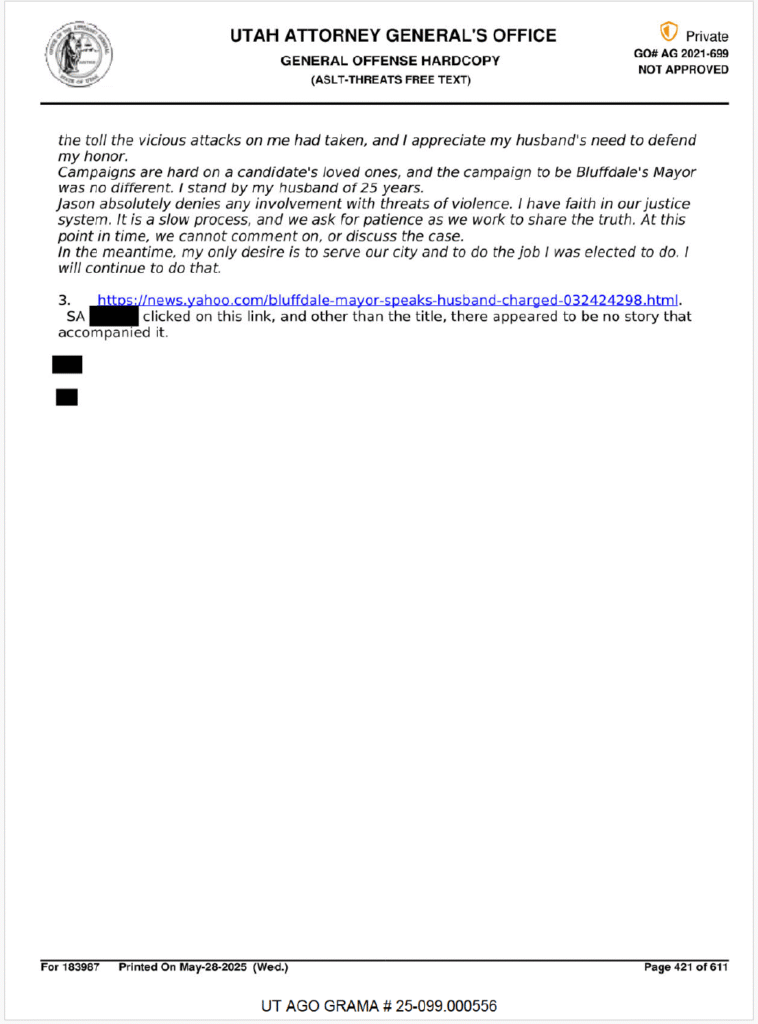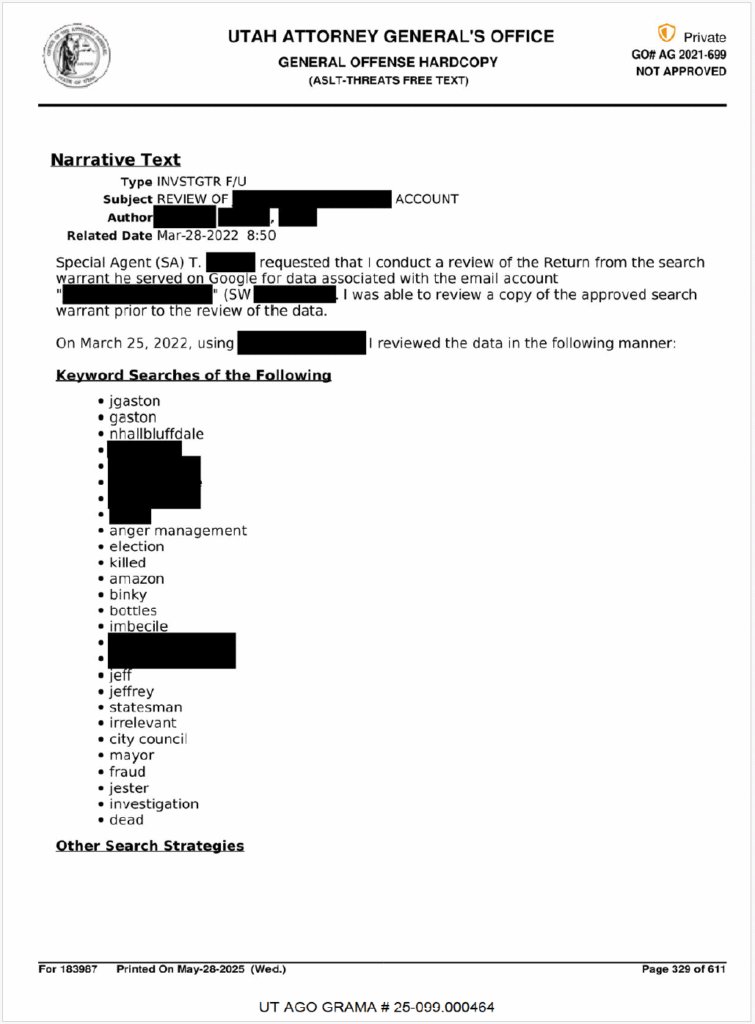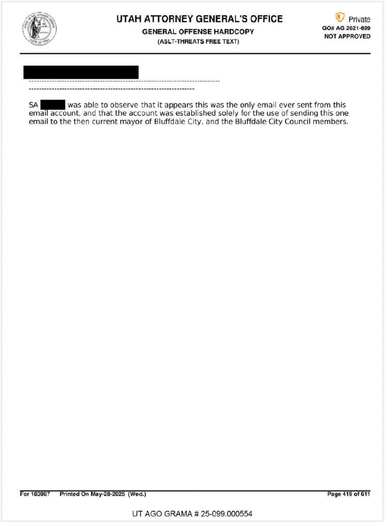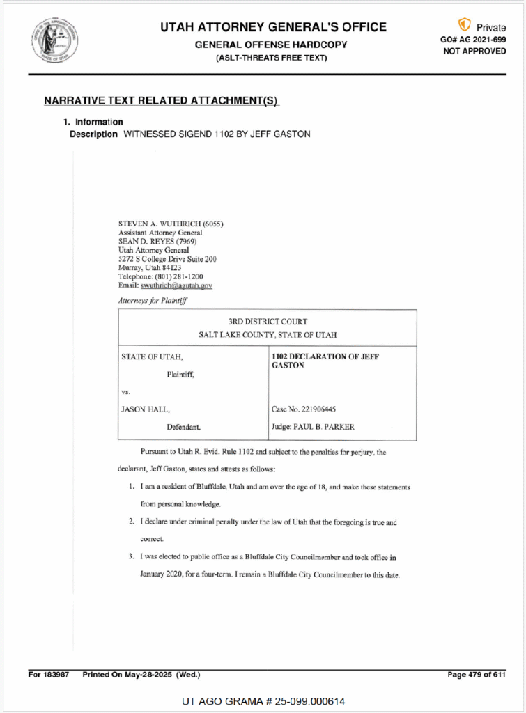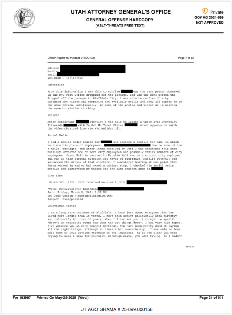 - 26 May 2022 Report of the reply data for the search warrant issued to Yahoo concluding that the email address which sent the email to the Bluffdale City Council about Jeff Gaston was associated with Jason Hall