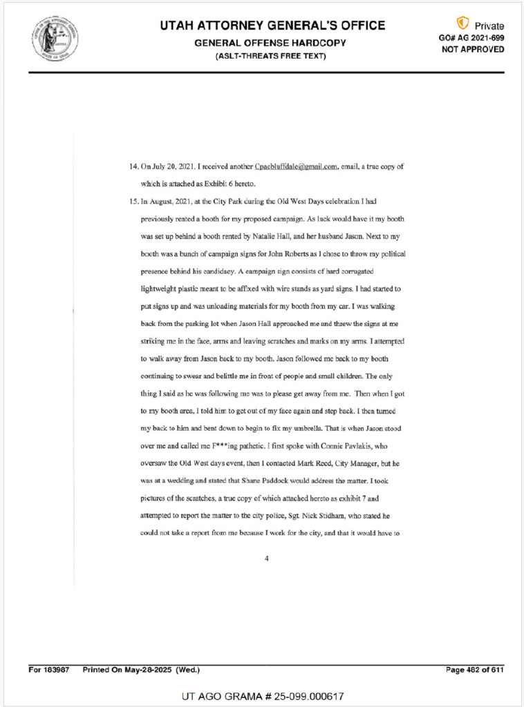 20 May 2025 Jason Hall’s report of the incident at Old West Days on 14 August 2021 was filed in an answer to a civil lawsuit. See the account beginning in numbered point 89.