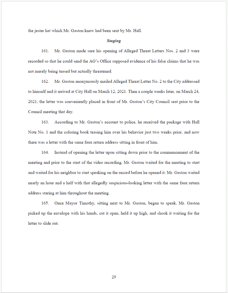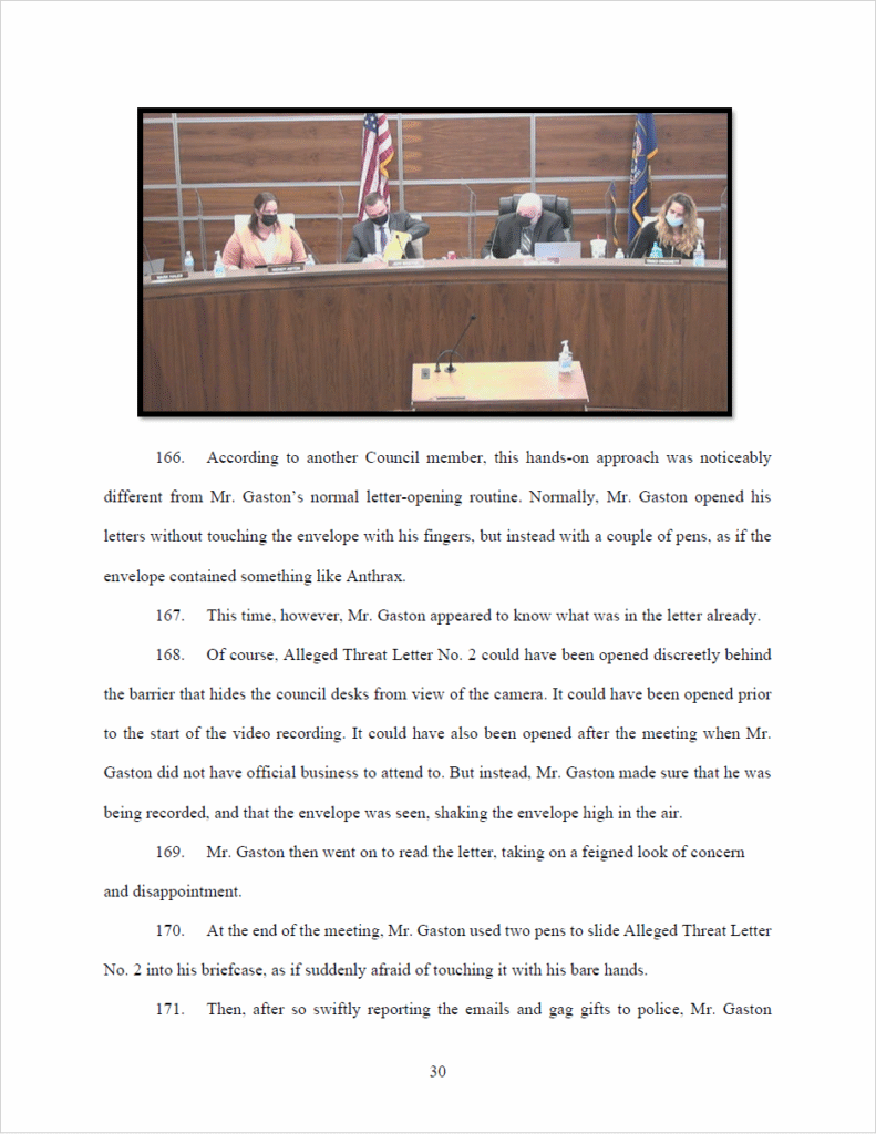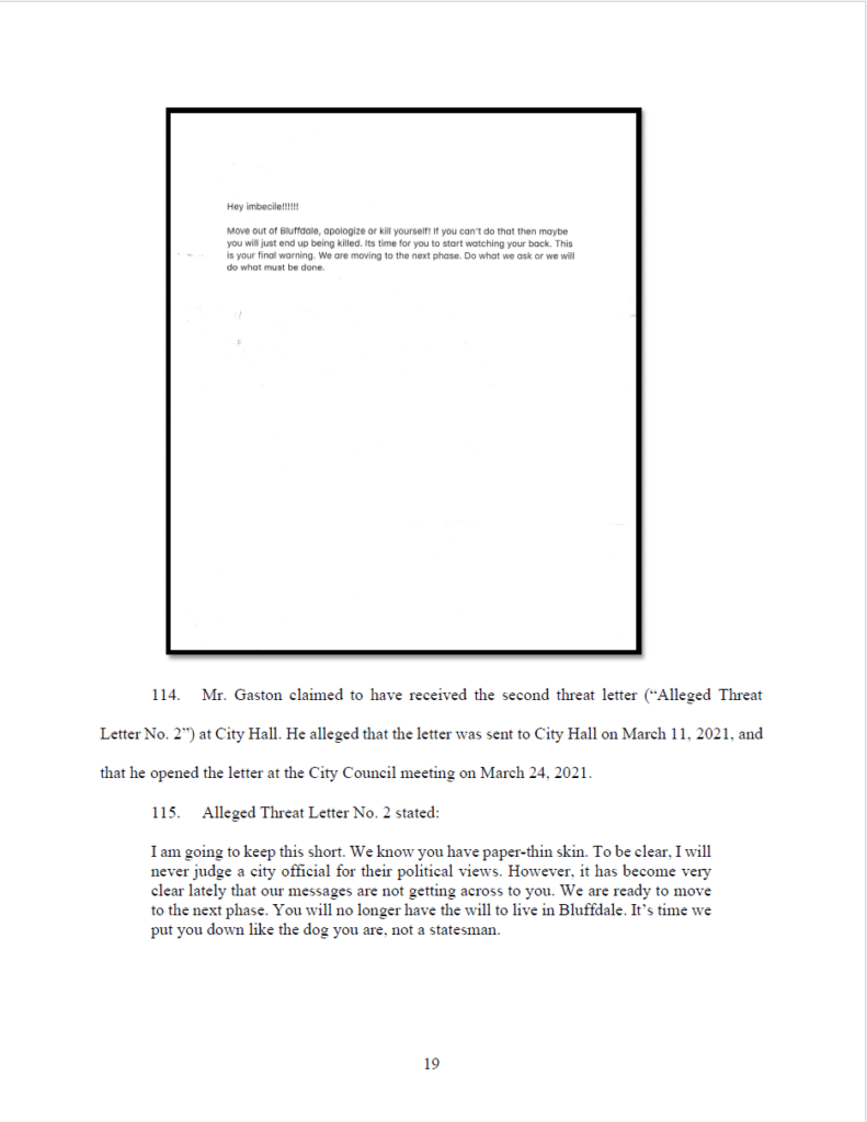 - 11 March 2021 Letter mailed to Jeff Gaston at City Hall including the words, ” “It’s time we put you down like the Dog you are…” (Councilman Gaston received and opened the letter during the City Council Meeting on 24 March 2021.)