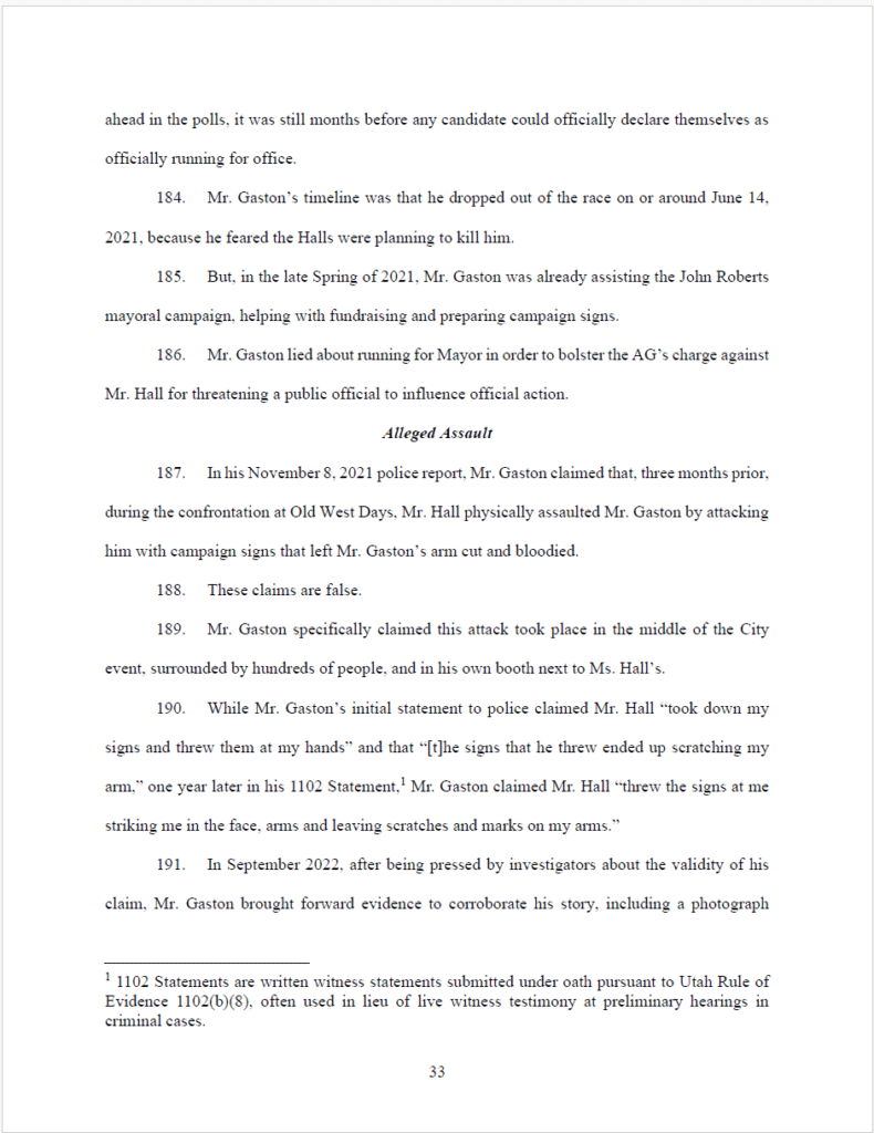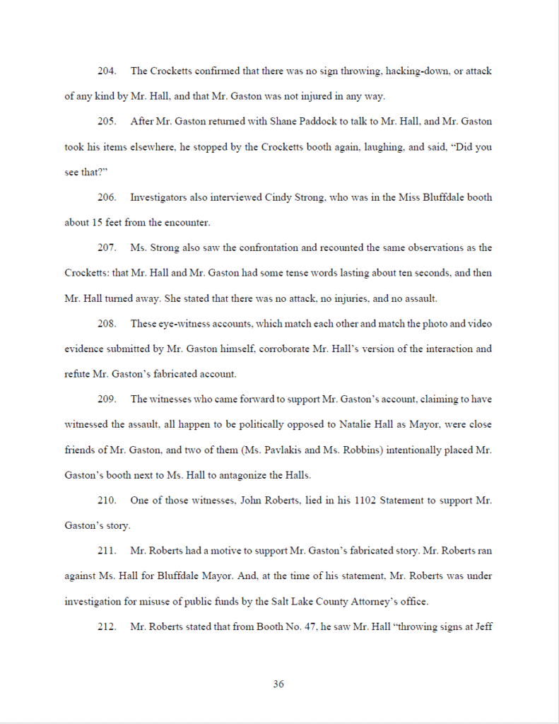 Late June 2021 Jeff Gaston decides not to run for mayor. 4 July 2021 Jeff Gaston starts supporting John Robert’s campaign for mayor. See items 4 and 13 of the Jeff Gaston witness testimony contained in this document. Also, see Jason Hall’s references to Gaston running for mayor in his June 14, 2021 email sent to Gaston through the cpacbluffdale@gmail.com account.