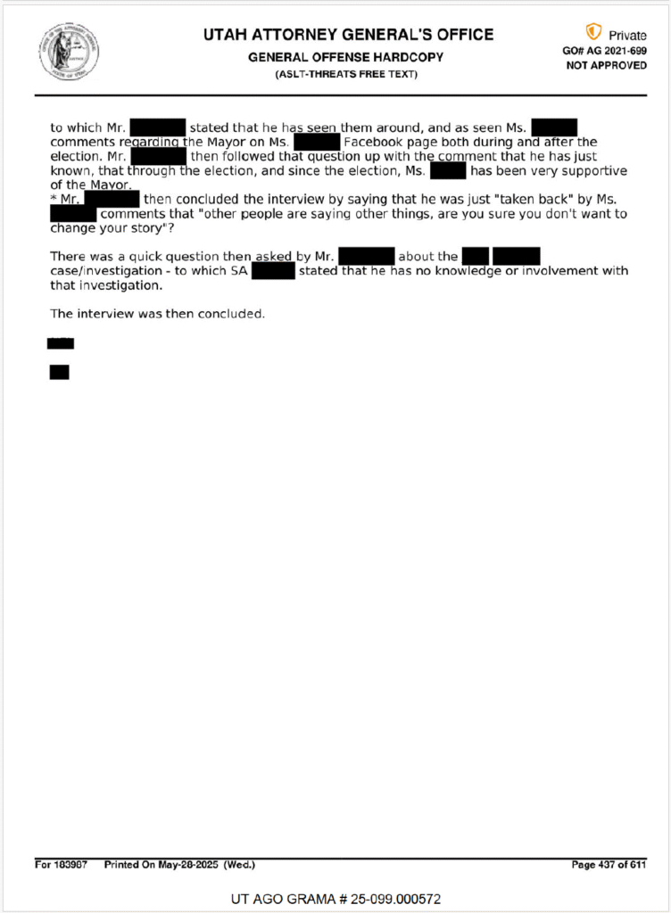 - 29 July 2022 Witness interview of the Former Mayor of Bluffdale City