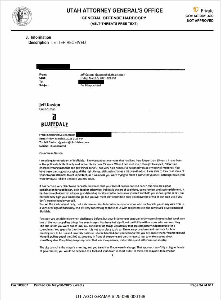 20 July 2021 Brief email sent to Gaston mocking him for supporting John Roberts for mayor, laced with extremely vulgar language. Sent from cpacbluffdale@gmail.com. Jason Hall later admitted to sending this email.