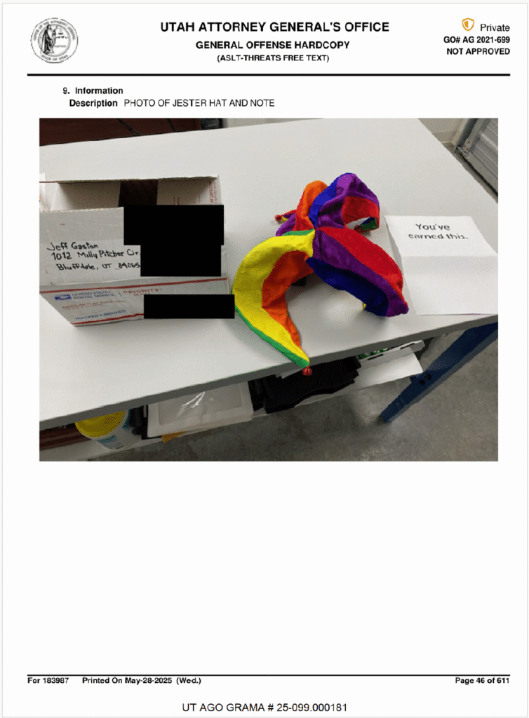 - 2 November 2021 George Schliesser mails a box to Jeff Gaston at Gaston’s home with a jester’s hat and including the note, “You’ve earned this.” The return address was “1154 S 300 W/ SLC, UT 84101,” which is the address of a business called Social Axe Throwing.
