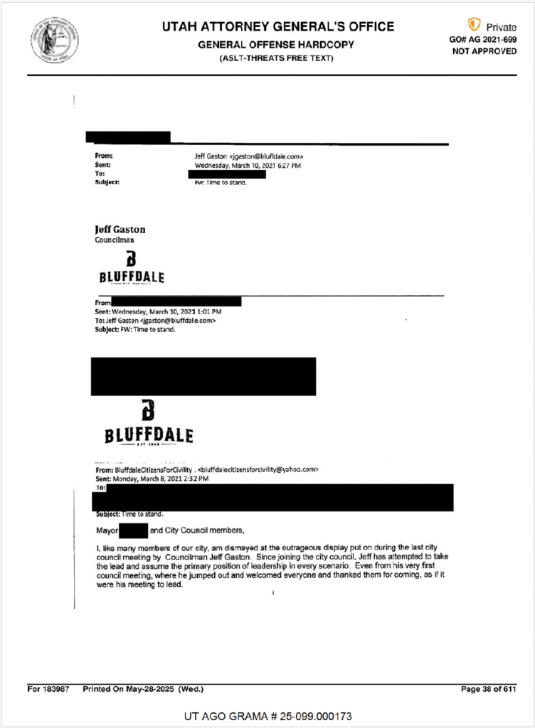 - 8 March 2021 Email with the subject, “Time to Stand” which was sent to the Bluffdale City Council members, mayor, and other city officials, advising them on how to deal with Councilman Jeff Gaston, and accusing him of lacking decorum, grandstanding, and being a bully, among other things. It purports to be from a group called “Bluffdale Citizens for Civility,” and was sent from bluffdalecitizensforcivility@yahoo.com. Jason Hall admitted to having sent this email.