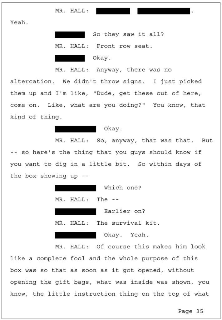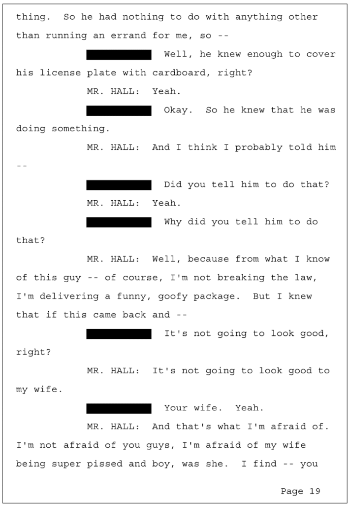 - 17 March 2023 Interview of George Schliesser, the employee of Jason Hall, in which he admits delivering the packages for him