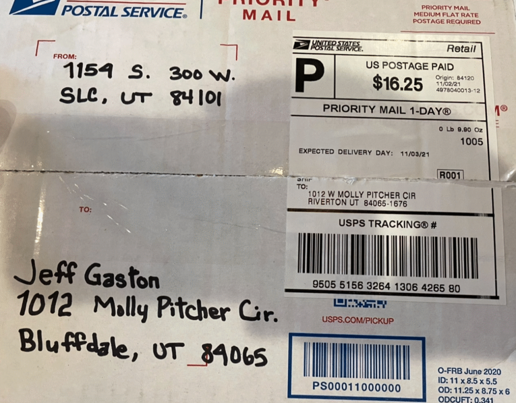 2 November 2021 George Schliesser mails a box to Jeff Gaston at Gaston’s home with a jester’s hat and including the note, “You’ve earned this.” The return address, written as “1154 S 30 W/ SLC, UT 84101,” is the address of a business called Social Axe Throwing.
