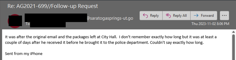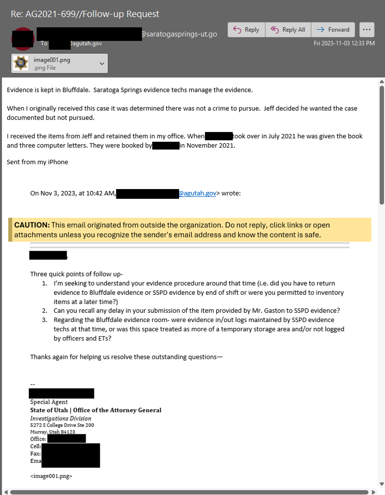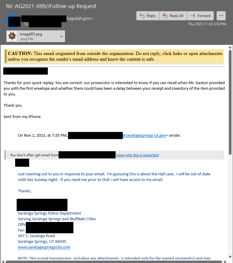 1 November to 3 November 2023 Emails between Bluffdale City Police and the Utah Attorney General’s Office stating that Jeff Gaston gave the police the two March 2022 threat letters within a couple of days of receiving them, directly refuting Natalie and Jason Hall’s claim that he waited 8 months